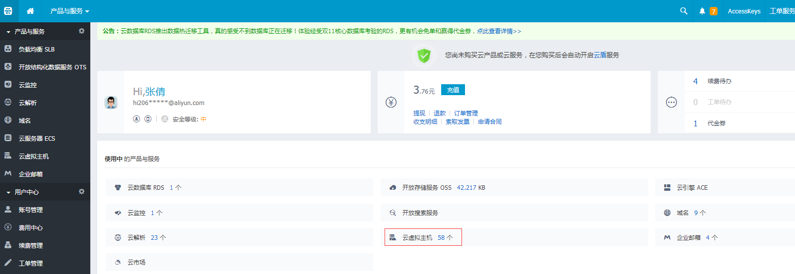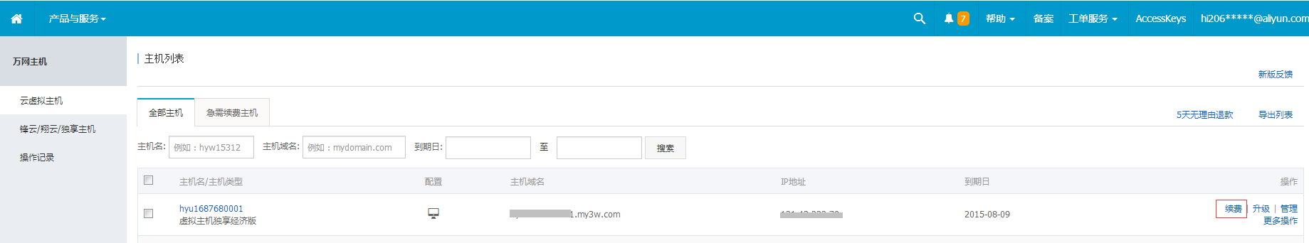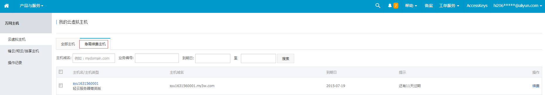 主机续费的流程介绍 第一步、首先登录万网wanwang.aliyun.com,进入管理控制台,在已开通的产品与服务中选择“云虚拟主机”,如图所示: 第二步、查看主机列表并选择需要续费的主机,再点击的“续费”,如图所示: 第三步、续费页面,选择主机续费年限,系统会自动计算对应价格,再点击“下一步”,如图所示: 第四步、选择支付方式,支付订单,完成主机的续费,如图所示: 第五步、如果主机已经过期,那么可以进入“我的主机”中的“急需续费主机”中直接进行续费操作。 特别提醒:主机过期后15天系统将自动释放资源,主机释放后数据将不能找回,不能再进行续费。如果需继续使用,请及时进行续费! 温馨提示: 1、如果需要申请发票,请在订单支付完成后,登录会员中心-发票管理,进行索取发票,请参考《申请发票流程》。 2、其他付款方式请参考《如何进行线下汇款》。 上一条: 主机升级的流程介绍 下一条: 云虚拟主机能不能升级ECS