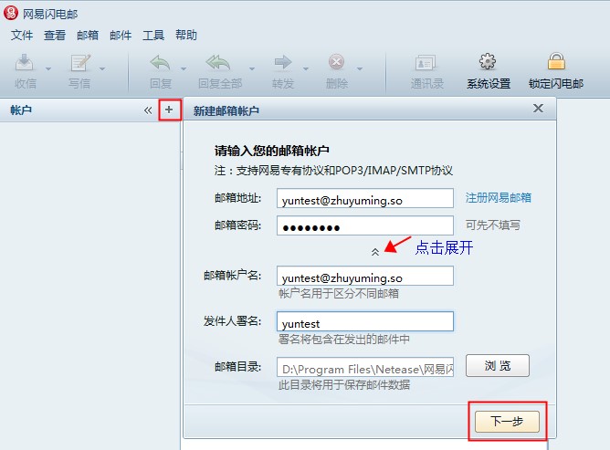 企业邮箱使用网易闪电邮软件如何设置 使用阿里云企业邮箱,在网易闪电邮客户端软件中的详细设置步骤参考方法如下所述: 1)、选择点击“账户”后方的加号按键,进入“新建邮箱账户界面”,输入邮箱地址(完整的邮箱账号全拼)和正确密码; 再单击下方按钮展开全部内容,输入邮箱账户名(完整的邮箱账号全拼),输入完成后进入下一步,如下图所示: 2)、【用户名】一栏补充未完整的邮箱地址全拼;“接收服务器”后方的【协议】下拉框,可根据需要选择使用的收信协议为POP或者IMAP,设置收信协议及服务器信息。如图所示: IMAP协议,接收服务器名称:imap.mxhichina.com,端口号143,ssl加密端口993; POP协议,pop3.您的邮箱域名,端口号110,ssl加密端口995,或者接收服务器名称:pop3.mxhichina.com; 发送服务器名称:smtp.mxhichina.com,端口25,ssl加密端口465. 3)、可以通过查看“高级设置”,确认“发送服务器(smtp)需要验证”已经勾选; 点击【确定】-->【完成】按钮保存所有设置 。如图所示: 4)、根据界面提示和使用需求,选择收取的邮件范围,点击“开始收信”完成设置后就能够使用。如图所示: 温馨提醒:这里要请留意与邮箱账户本身设置的pop收信范围区别:邮箱账户内设置的为任意软件使用pop方式接收邮件范围;而当前所用软件的提示项,为账户设置基础上的在当前软件中pop代收的邮件范围。 如果问题还未能解决,请联系售后技术支持。 上一条: 文件夹管理和新建标签方法。 下一条: 企业邮箱使用客户端报错及常见问题解决参考