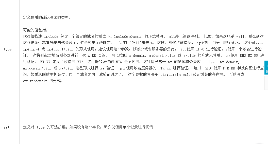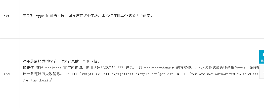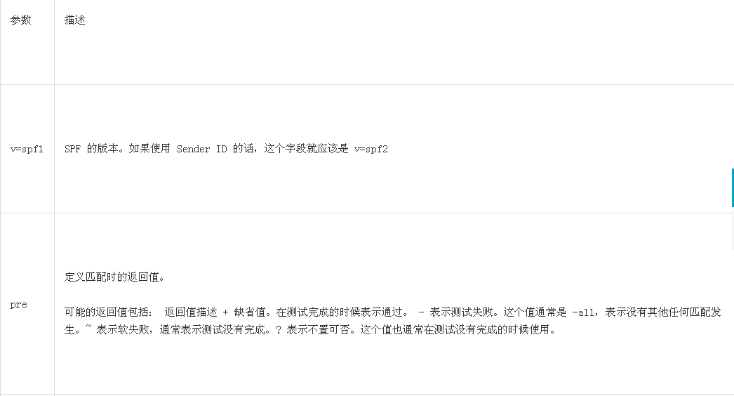 邮箱域名的spf记录怎样添加 一、SPF是什么? SPF就是Sender Policy Framework。SPF是一个反伪造性邮件的解决方案,可以防止别人伪造你来发邮件。当你定义了你的domain name的SPF记录之后,接收邮件方会根据你的SPF记录来确定连接过来的IP地址有没有被包含在SPF记录里面。如果在SPF记录里面,则认为是一封正确的邮件;如果不在SPF记录里面,则认为是一封伪造的邮件。 我们可以参考RFC4408(http://www.ietf.org/rfc/rfc4408.txt),里面有更详细的信息。 二、增加SPF记录的方法 非常简单,只需在DNS里面添加TXT记录就可以了。登陆http://www.openspf.org在里面输入你的域名,选择点击 Begin,然后会自动得到你域名的一些相关信息。 a 你域名的A记录,通常情况下,选择yes,因为他有可能发出邮件。 mx 通常情况下也是yes,MX服务器会有退信等。 ptr 选择no,这是官方建议的。 a: 有没有其他的二级域名? 比如:mail.abc.com和www不在一台server上,则填入mail.abc.com,要不然就清空。 mx: 一般不会再有其他的mx记录了。 ip4: 你还有没有其他的ip发信?可能你的smtp服务器是独立出来的,那么就填入你的IP地址或者网段。 include: 如果有可能通过一个isp来发信,这个有自己的SPF记录,就填入这个isp的域名, 例如:hichina.com~all: 意思是除了上面的,其他的都不认可。当然是yes了。 好了,点击Continue…..,自动生成了一条SPF记录,比如abc.com的是v=spf1 a mx ~all,并且在下面告诉你怎样在你的bind里面添加一条abc.com. IN TXT “v=spf1 a mx ~all”加入你的bind,然后ndc reload就好了。 检查一下:dig -t txt extmail.org 如果您的域名是通过万网的dns服务器进行解析的,万网的网页上没有设置TXT记录的地方,但是如果你的DNS主server是在Hichina的,您可以在diy.hichina.com上设置。设置完毕后您就可以通过使用spf策略进行垃圾邮件验证了。 SPF 的 TXT 记录 SPF 记录包含在一个 TXT 记录之中,格式如:v=spf1 [[pre] type [ext] ] ... [mod] 每个参数的含义入下图所示: 上一条: 企业邮箱收到异地登录提醒的参考操作 下一条: 企业邮箱发送数量和频率的限制的说明