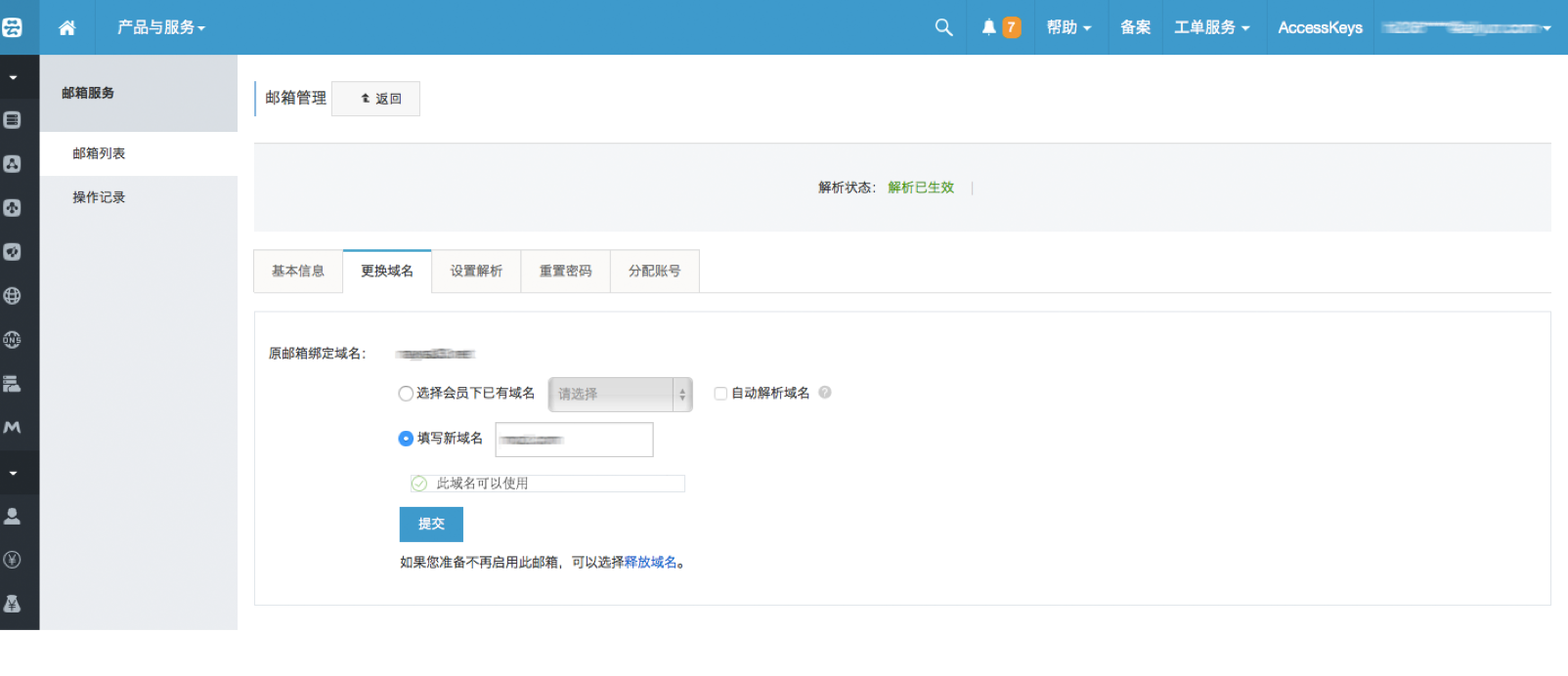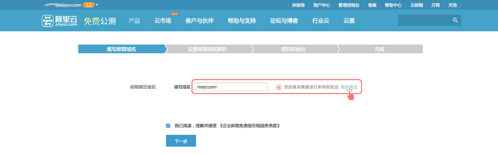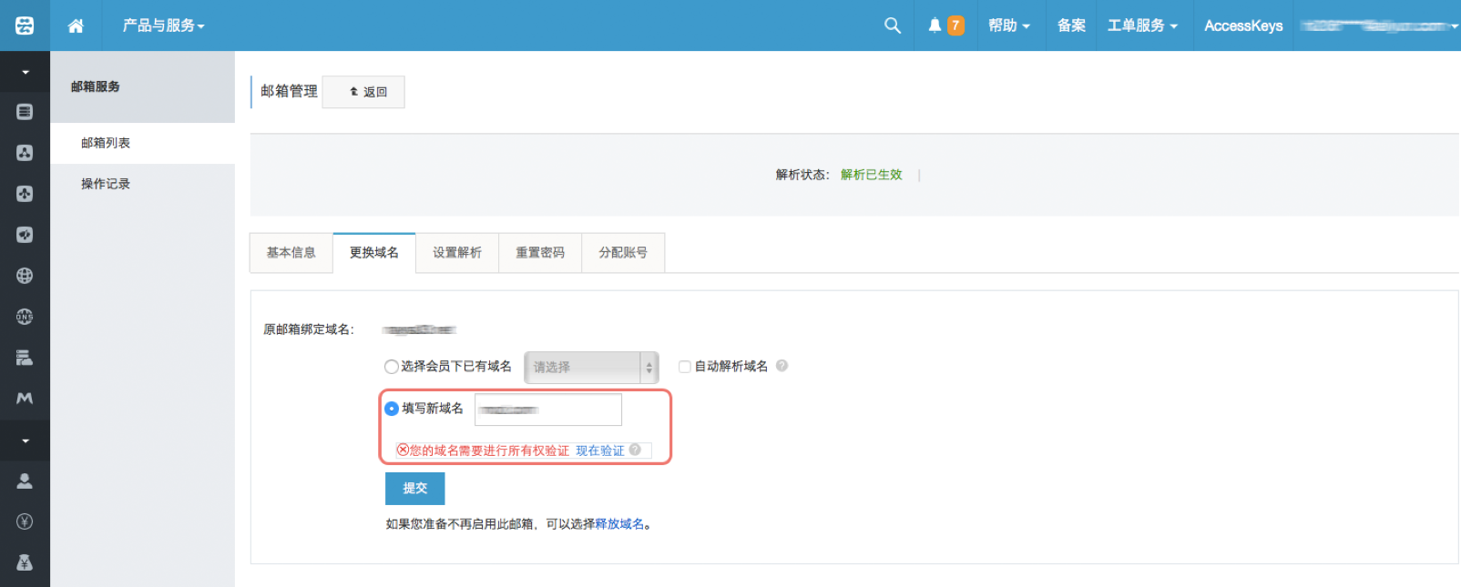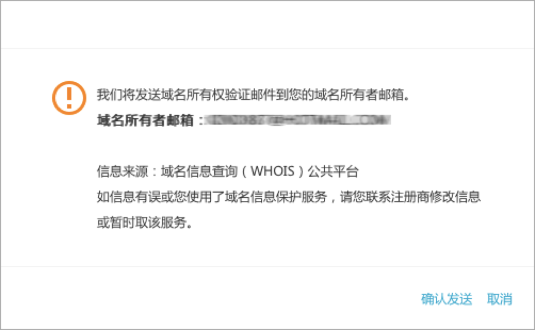 邮箱域名所有权验证的说明 为了避免恶意绑定他人域名,导致域名所有人不能正常开通邮箱的行为,即日起在申请免费邮箱和更换邮箱域名时,如果您填写的域名不是和邮箱业务在同一会员下,必须要通过验证后才能完成申请。 (1)、在申请免费企业邮箱时,如果您没有选择登录会员下的域名,请您先通过域名所有权验证。提示如下图所示: (2)、系统会根据域名whois系统查询这个域名的所有人邮箱,并给其发送所有权验证邮件,如图所示: 温馨提醒:如果正确,您可以“确认发送”,系统将发送邮件通知给域名所有人确认。如果不正确或者正在使用“域名信息保护服务”,请您暂时取消 (3)、域名所有人收到函件后,通过邮件内的确认链接,可以授权给万网会员使用这个域名进行邮箱的申请,如图所示: (4)、确认授权时,需要您登录申请邮箱并准备授权的万网会员,如果不是的话,请您重新登录。 (5)、验证成功后,可以继续完成登录,如图所示: (6)、更换域名时,同时也增加了这个验证,如图所示: (7)、系统会发送验证函件给域名所有人,域名所有人需要通过登录链接后确认此信息,如图所示: (8)、通过验证后,即可继续完成操作,如图所示: 如问题还未解决,请联系售后技术支持。 上一条: 万网云邮箱如何使用ssl加密协议登录邮箱 下一条: 云邮箱SPF记录的测试方法简介