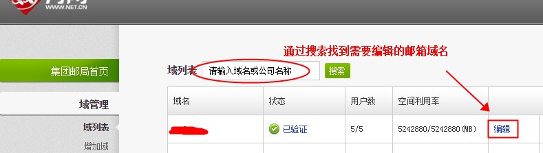 企业邮箱集团邮局的最大用户数是怎样增加的 针对云邮集团版的邮箱域,如果需要增加可分配账号总数,请参考如下的操作步骤: 1)、通过“如何增加企业邮箱使用人数”的方法,对集团版邮箱业务成功购买所需用户数; 2)、访问链接 http://groupmail.hichina.com ,登陆到云邮集团版超级管理员页面,为邮箱域调整设置可分配的邮箱账号总数,详细参考操作步骤和下面所列一样: 2.1、登录首页,此界面中显示的用户总数,为集团邮局业务的用户数信息,如下图所示: 2.2、在【域列表】中,通过搜索找到需要编辑的邮箱域信息,点击“编辑”按钮,如下图所示: 2.3、调整编辑“邮件域最大用户数”后,再点击“保存”按钮,就能够成功的对邮箱域可分配账号数增加。如图所示: 如问题未解决,请联系售后技术支持。 上一条: 企业邮箱部门名称如何重命名 下一条: 邮件组批量添加多个成员邮箱的方法