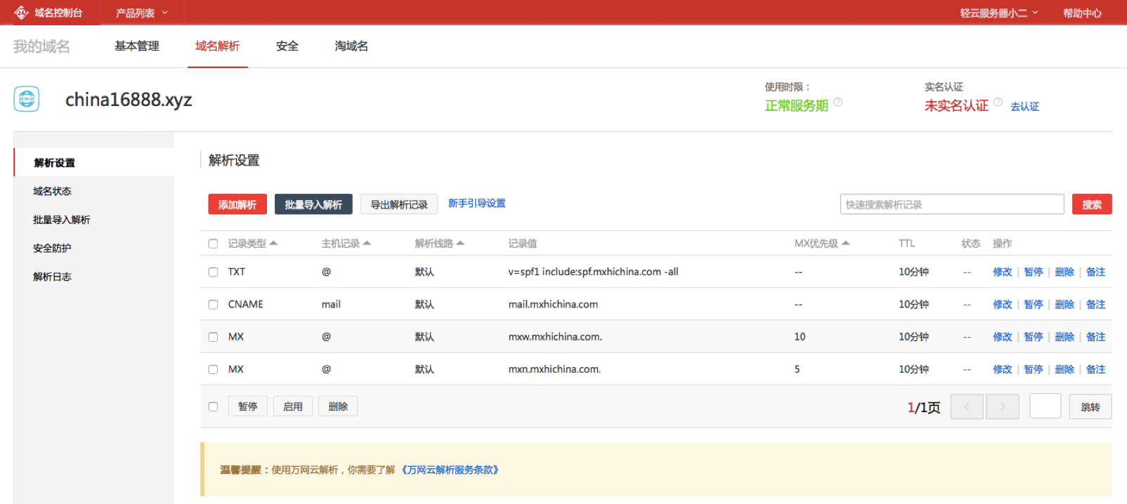 企业邮箱域名解析如何设置 1、如果您的邮箱域名和邮箱产品不在同一会员ID下,但使用阿里云默认DNS,那么则需要在您的域名服务提供商处手动设置域名MX解析,解析生效后才能够使用。 解析设置方法:在账户登录后,进入“产品管理 > 管理控制台 > 域名”,在列表中选择需要解析的域名,点击“解析”链接,根据系统提示完成对域名的解析。如图所示: 进入“域名解析”界面,点击“添加解析”选项。如图所示: 2、如果您的邮箱域名解析服务(DNS)是阿里云默认DNS,且您的域名和您所购买的企业邮箱在同一会员ID下,那么您可以直接选择“设置解析”标签,系统会自动完成邮箱域名解析的工作,操作完成后不需要再进行手工设置解析的操作,或者点击邮箱基本信息页面中的“设置解析”。(参考《企业邮箱开通指南》第一步) 如果您购买的域名和您购买的企业邮箱再统一会员ID下,但域名MX自动解析未生效,您可以在“设置解析”标签页下点击“检查域名解析”按钮,系统会自动对您域名解析的状态进行检查和更新,具体操作流程如下所示: 3、如果您的域名和dns服务全部不是阿里云提供,请联系您的域名服务商协助您设置域名解析。 云邮箱具体添加记录如下图所示: 一般解析生效时间为10分钟左右,请您成功设置后,耐心等待生效。 上一条: 邮件组批量添加多个成员邮箱的方法 下一条: 企业邮箱忘记密码了怎么办?