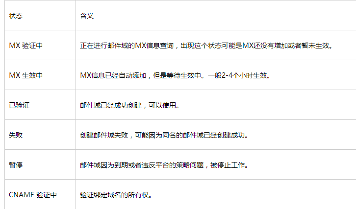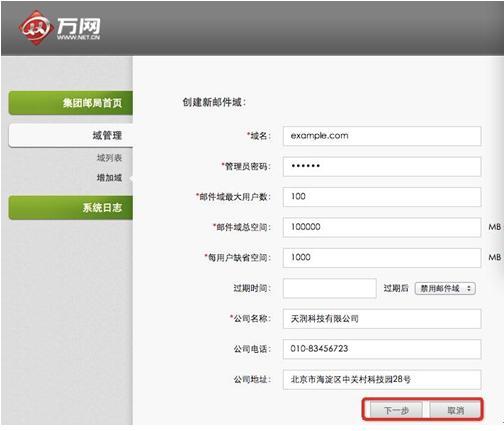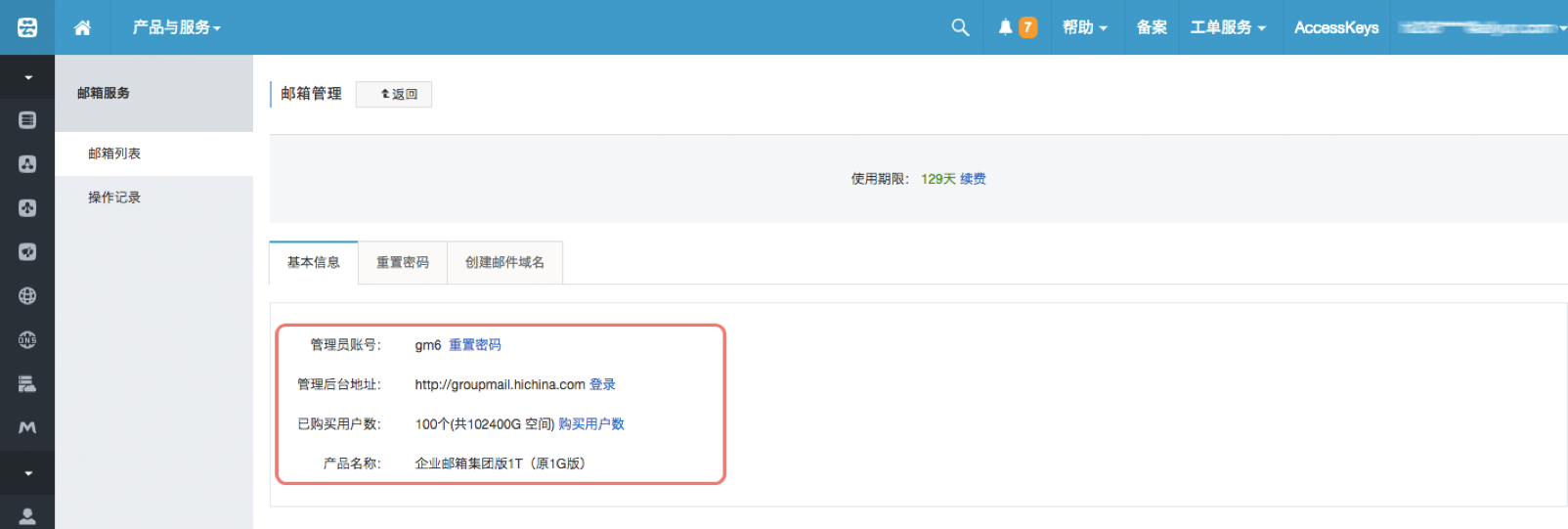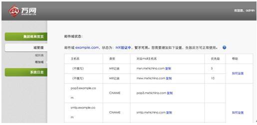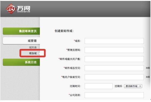 云邮集团版创建邮件域的方法 企邮集团版在购买完成后,进入“会员中心”-“我的邮箱”中可以查看集团邮局超级管理员的权限。 1、 设置超级管理员登录密码: 当您初次使用所购买的企业邮箱时,为了保障账号信息安全,系统没有将邮箱管理员密码显示到邮箱基本信息页面中,因此,需要在此页面中首先设置超级管理员密码。 管理员密码:在“重置密码”中设置的密码; 管理员账号:邮箱信息页面中查看。 2、创建邮件域: (1) 登陆企邮集团版的管理界面(http://groupmail.hichina.com)。 (2) 点击左侧的“增加域”功能。如图所示: (3) 在右侧添加必要的信息后,点击下一步完成邮件域的创建,如图所示: (4) 创建完毕后,会提示用户完成后续的操作,如图所示: (5) 点击确定,回到邮件域列表查看邮件域状态,如图所示: 温馨提醒: 目前邮件域的状态如下图列表: 通常情况下,创建的邮件域名可以修改配置。但是修改后的账号数目不能小于已经创建成功的账号数目,同时空间总额不能小于已经使用的空间配额。 如果问题还未能解决,请联系售后技术支持。