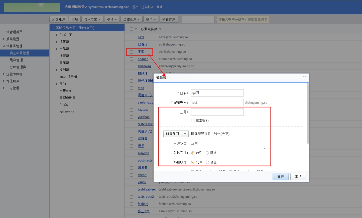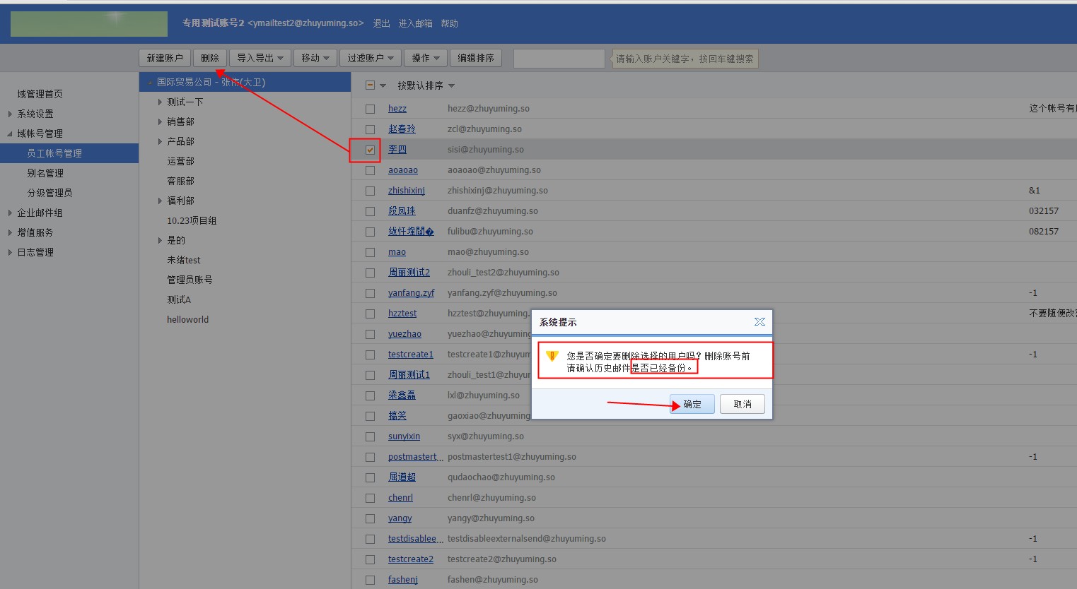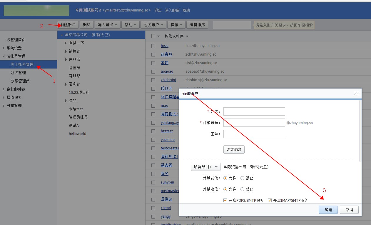 云邮箱子账号创建、编辑与删除的相关说明 当我们企业云邮箱业务成功购买之后,系统会默认分配一个管理员帐号,管理员帐号名称是postmaster,这个帐号名称不允许修改,以来来说,只能通过管理员帐号对域下子账号的管理只能通过【登录webmail邮箱】—【域管理页面】操作。 创建子账号方法,请参考下面的截图: 删除子账号方法,参考下面截图:(温馨提醒:执行删除帐号操作后将不能通过邮件恢复功能恢复该帐号数据) 编辑子账号方法,请参考下面截图: 特别提醒: postmaster管理员邮箱的密码如果被遗忘了,可以参考企业邮箱忘记密码的解决方法重新设置 如果问题还未能解决,请联系售后技术支持。 下一条: 关于雅虎邮箱迁移至阿里云邮箱的FAQ