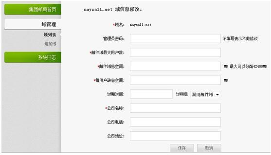 云邮集团版修改邮件域的相关配置操作 操作方法介绍: 首先,登陆到云邮集团版管理员页面,登陆地址:http://groupmail.hichina.com,然后,在“域管理”中进行邮件域配置的修改,如下图所示: 温馨提醒:切记修改后的账号数目一定不能小于已经创建成功的账号数目,同时空间总额也一定不能小于已经使用的空间配额。 如果问题还未能解决,请联系售后技术支持。 上一条: 关于企业邮箱所有账号的邮件备份方法介绍 下一条: 域管理首页相关项目