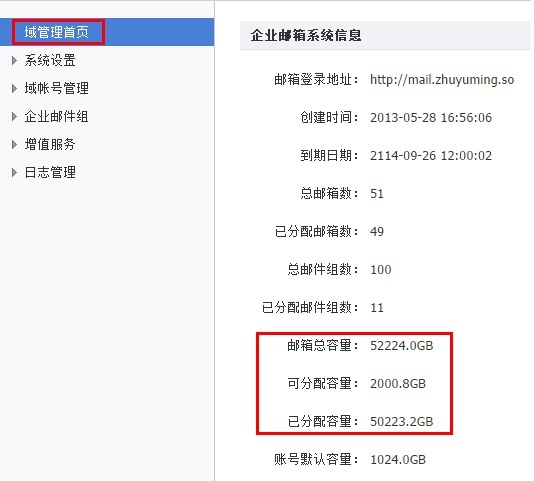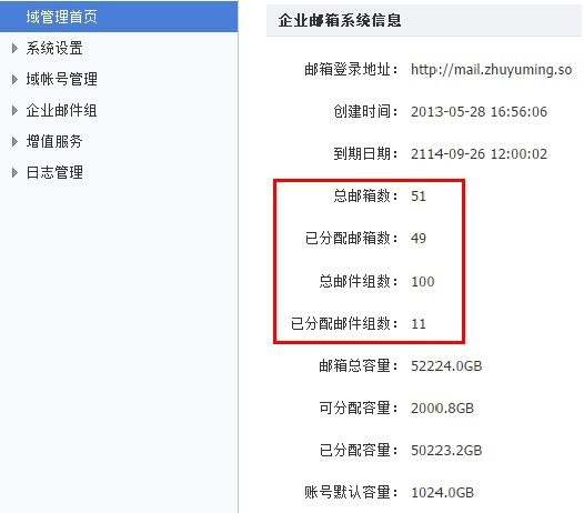 域管理首页相关项目 一、查看邮箱总容量以及已使用容量的方法 1、使用管理员postmaster登录企业邮箱,默认进入“域管理首页”后可以查看到邮箱总容量以及已使用容量。如图所示: 二、查看邮箱可分配用户数及已分配用户数方法 1、使用管理员postmaster登录企业邮箱,默认进入“域管理首页”后可以查看到总邮箱数及已分配邮箱数。如图所示: 上一条: 云邮集团版修改邮件域的相关配置操作 下一条: 企业邮箱群发邮件功能的介绍