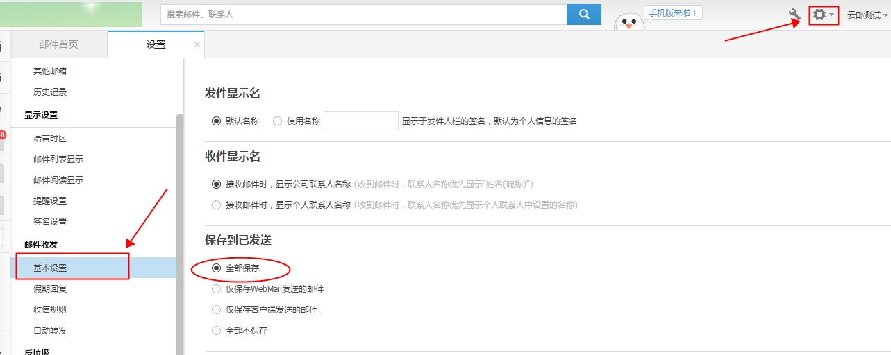 企业邮箱通过邮件客户端发送的邮件在WebMail已发送邮件夹无法看到的解决 问题描述: 企业邮箱通过邮件客户端发送的邮件在WebMail已发送邮件夹无法看到 解决方法: 遇到该类问题,请先登录邮箱帐号webmail页面,选择点击“webmail邮箱设置”按钮(如下图所示) 进入【webmail邮箱设置】—【邮件收发】—【基本设置】,检查“保存到已发送”的选项,根据使用需求进行选择。 各个选项释义如下所述: 1)、全部不保存——所有的方式发送的邮件,都不保存在web已发送文件夹。 2)、全部保存——通过webmail或者客户端smtp方式,所有的方式发出的所有邮件都保存到web已发送文件夹。 3)、仅保存WebMail发送的邮件——只有在webmail发送的邮件才保存到web已发送文件夹,客户端smtp方式发送后只在客户端软件的已发送信箱可见。 4)、仅保存客户端发送的邮件——只有客户端发送的邮件才保存到web已发送文件夹;webmail发送的邮件不做保存。 如果问题还不能解决,请联系阿里云售后技术支持。 上一条: 企业邮箱设置邮件回复接收地址的方法 下一条: 通过企业邮箱webmail打印邮件的步骤