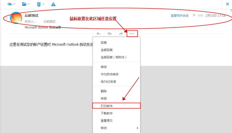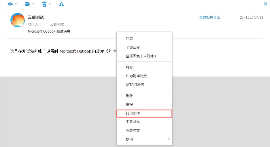 通过企业邮箱webmail打印邮件的步骤 企业邮箱webmail的【打印邮件】功能,可以直接在查看邮件的时侯对邮件内容进行打印,具体参考操作步骤如下所述: 1、首先,登录企业邮箱webmail页面,选择点击打开需要打印的邮件至邮件查看界面; 2、选择【打印邮件】功能,就能够进行打印。 对于【打印邮件】选项的查找选择,下面提供两种方法供参考: 方法1:将鼠标放置在邮件正文上方的主题内容栏(下图两条横线中间位置),在出现的选项框点击【...】图标,再弹出框选择【打印邮件】。如图所示: 方法2:在邮件内容页面任意位置单击鼠标右键,在弹出的选项栏中点击【打印邮件】。如图所示: 温馨提醒:打印邮件功能的最基本需要是您的本地电脑已经安装并设置好打印机了。 如果问题还未能解决,请联系售后技术支持。