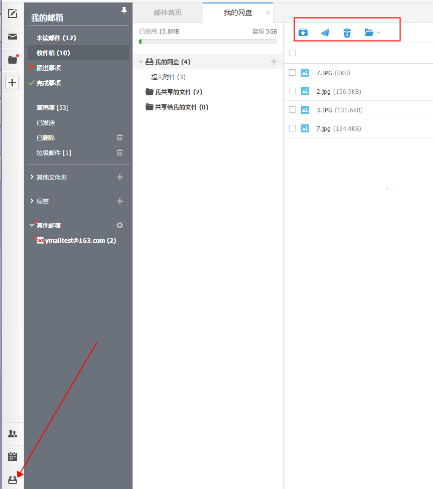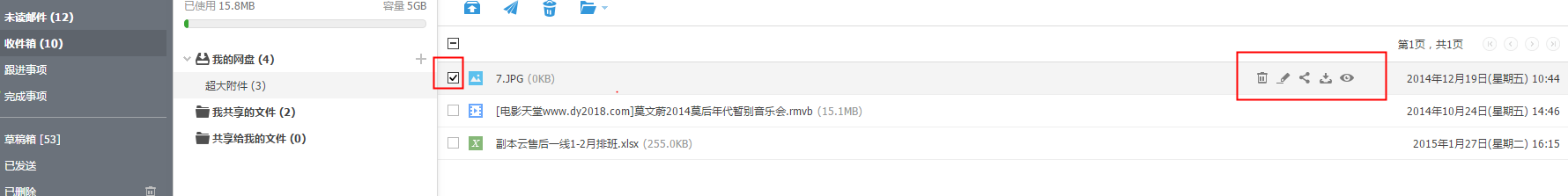 企业邮箱网盘常见操作的说明 企业邮箱网盘可以提供大文件网络临时存储、分享和超大附件上传的服务,常见操作介绍如下: 一、如何看网盘空间大小? 免费版企业邮箱网盘容量为2G/账号,可最大上传的文件容量 为2G。 付费版企业邮箱网盘容量为5G/账号,可最大上传的文件容量为3G。 如果上传的文件大小已经超过网盘剩余容量大小,就不能上传成功。 写信中的超大附件上传是与网盘紧急结合的,所以请务必确认上传的超大附件,网盘剩余容量可支撑(普通附件支持50M以内附件上传发送,此50M占用是邮箱空间容量,非网盘容量)。 查看网盘使用情况,如下图所示: 二、 网盘文件上传、发送、移动。如下图所示: 三、 网盘文件编辑、下载、预览、共享、删除。如下图所示: 温馨提醒:使用超大附件上传到网盘中的文件,如果从网盘中被删除,那么对应收件人也将不能下载对应邮件的超大附件了。 如果问题还未能解决,请联系售后技术支持。 上一条: 企业邮箱设置自定义LOGO和登陆页的方法 下一条: 企业邮箱帐号是怎样更改个人显示姓名的