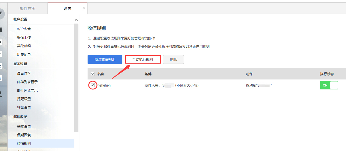 企业邮箱建立收信规则及对历史邮件分类的方法 使用企业邮箱的【收信规则】功能时,如果需要对历史邮件按照邮件规则自动分类,可以通过下面两种方式实现: 方式一:企业邮箱设置收信规则的方法,点此查看。 方式二:手动执行分类:登陆企业邮箱,点击页面右上角的【设置】,在设置页面中,点击左侧列表【收信规则】,选中要启用的分类规则,点击【手动执行规则】,选择要执行规则进行分类的类别即可。如图所示: 温馨提醒:收信规则的【执行状态】为ON时规则方可生效。 如果问题还未能解决,请联系售后技术支持。 上一条: 企业邮箱WebMail未读邮件查阅的方法 下一条: 企业邮箱自动回执功能设置的方法