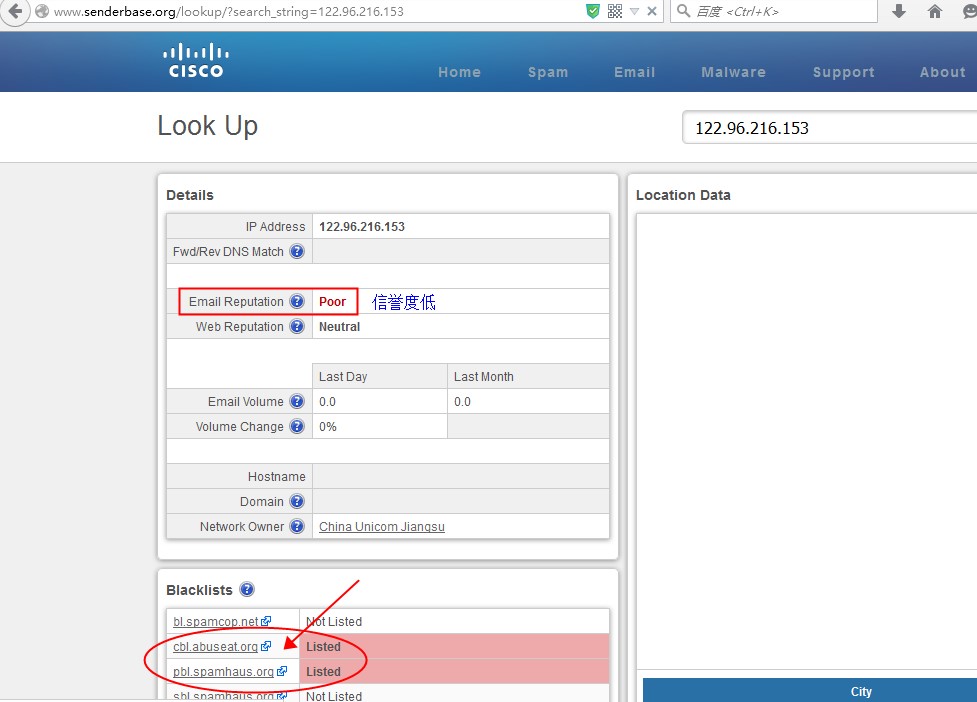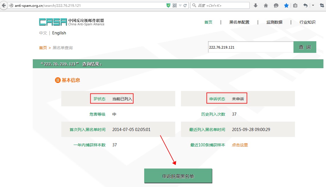 企业邮箱收信失败拒绝内容reject by behaviour spam**list on rbl sites的情况 问题现象描述: 企业邮箱接收邮件失败,发信系统端收到我方服务器拒绝返回的信息,或者发信方收到失败的退信通知内容,主要包含如下内容: host mxn.mxhichina.com[42.120.219.27] said: 554 Reject by behaviour spam at DATA State(Connection IP address:*****)ANTISPAM_BAT[***]:list on rbl sites 或者如下: host mxn.mxhichina.com[42.120.219.27] said: 554 Reject by behaviour spam at DATA State(Connection IP address:*****)ANTISPAM_BAT[***]: bad sending 这是由于当时来信的对方发信服务器ip地址(也就是以上内容中显示的Connection IP address:),被检测有在反垃圾组织中判断信誉度较低、有垃圾邮件发送行为;为了避免我方邮箱系统免受此类低信誉度IP的恶意来信骚扰,所以对此类发信ip的邮件,我方系统会选择直接拒绝接收。 与此同时,这类情况下阿里云邮箱拒绝其来信是由于我方系统采用的对应反垃圾策略定义;不同的邮箱系统可能会采用不同的反垃圾策略,所以已被列黑的发信ip,此时还可能可以向其他的非阿里云邮箱发信,请务必注意区分。 解决办法简介: 检测发信IP地址在下述反垃圾组织官网中是不是已经被列黑,又或者判断信誉度较低。如果有的话,请及时将查询结果由发信方的邮箱服务商对应对其服务器ip地址解封,不同的反垃圾组织解封流程各有所不同,详细的解封步骤我们没有办法具体说明,具体的被列黑组织名称、网站等的查看方法如下: 1、中国反垃圾联盟:http://anti-spam.org.cn/,如下图所示: 界面所示的“IP状态”就为目前所查询ip的信誉度状态;“已列入”意思是所查ip已被中国反垃圾联盟列黑; “申诉状态:未申述”,意指暂时当前次ip还没有被申请移除黑名单; 绿色按钮如文字内容所示“申诉脱离黑名单”,可通过此按钮申请移除脱离黑名单,后续具体操作步骤非我方系统所定义,在此就不做更多详细的说明。 2、国际反垃圾组织senderbase:http://www.senderbase.org,如下图所示: 注意!此界面所示:Email ReputationEmail Reputation,表示邮件ip信誉度,“Poor”即表示信誉度较低。 “Blacklists”以下所列出的为各个对应的反垃圾组织名称,点击进入对应官网,就能够查询详细的为什么他会被列黑。 如问题还未解决,请联系售后技术支持。