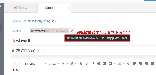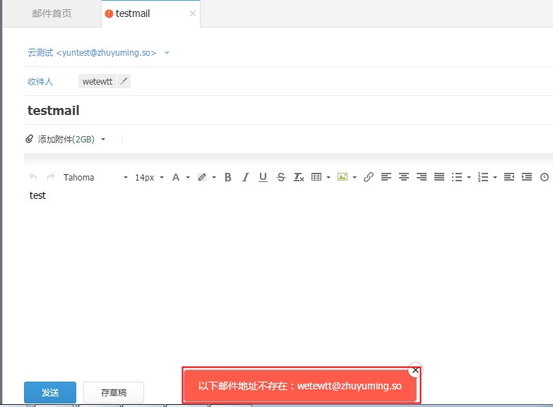 常见的企业邮箱webmail发信报错 通过邮箱webmail发送邮件的时侯,如果遇到发信失败产生报错的情况,可以参考下面对应的错误原因和解决方法: 1、报错提示“以下邮件地址不存在:***** ”。 这种情况是指收信邮箱地址为同一后缀、但是账户名并不存在的账号,建议请确认更改为正确的用户名(@前方内容)后,再重新发送。如下图所示: 2、发信报错,提示“邮箱域名不存在”。 这就是指所输入的收信邮箱账号,@后方的域名本身是不存在的,请点击铅笔样式的按钮,修改编辑为正确收信邮箱域名后再进行重试。如下图所示: 3、报错 提示“由于未知错误,此邮件发送失败”。 如果是向任意外域账号发信均产生此报错,请参考《企业邮箱无法向任意外域邮箱发信》的方法解决。如下图所示: 4、报错提示“收件人地址不存在”。 这个报错的意思是收信账号,是一个在本系统内部中存在邮箱域记录,但是邮箱账号不存在的邮箱地址,请参考下面所列的参考解决方法: A、与收件人核实确认正确的收信账号名称,更改后重新发送; B、如果收信方的域名,已经改用另外的非万网邮箱,请转告收件人最好及时参考《企业邮箱更换邮箱绑定域名》的方法,将其现有的万网邮箱业务,更改为其他的域名名称,使当前的域名从万网邮箱系统中解绑后,再进行重试观察。 如下图所示: 5、 报错提示“发件人地址错误”。 这个报错的意思是发信邮箱账号,在本系统中检测是不可用状态,解决方法请参考《企业邮箱提示发件人地址错误》。如下图所示: 如果问题还未能解决,请联系售后技术支持。