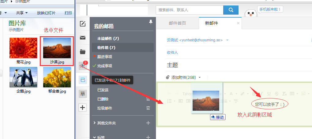 企业邮箱Webmail是怎样发送附件的 当我们通过企业邮箱webmail发送附件的时候,可以根据文件大小,选择通过普通文件或者是超大文件的方式分别上传发送,下面所列的为附件上传方法,首先,请点击【写邮件】按钮,进入邮件编辑界面 一、共有两种上传方法可供选择当我们上传普通文件时,分别是:选择文件上传和拖拽文件上传 1、拖拽文件上传:打开本地图片所在文件夹,选择需要上传的文件-->直接拖拽至编辑邮件界面“添加附件”下方的区域-->看到“您可以放手了:)”内容时,放手就可以上传了。如下图所示: 2、选择文件上传:点击“添加附件”按钮-->选择需要上传的文件-->点击打开,上传就可以了。如下图所示: 上传完成时,您将会看到下面所显示的状态: 二、共有3种方法可供选择当我们上传超大附件的时候:在邮件编辑界面选择“从网盘选择”、“添加超大附件”,以及进入【我的网盘】界面,选择文件后发送邮件。 1、从网盘选择:点击“添加附件”后方的下拉按钮-->选择“从网盘选择”,如下图所示: 然后-->选中需要上传的文件-->点击“确定”按钮上传,如图所示: 超大文件上传成功时界面显示如下图: 2、添加超大附件:点击“添加附件”后方的下拉按钮-->选择“添加超大附件”-->选中需要上传的文件-->通过“打开”按钮点击上传,如下图所示: 3、进入【我的网盘】界面,选中需要发送的文件-->点击上方的发送邮件按钮,如下图所示: 进入邮件编辑界面,看到超大文件已上传成功,如下图所示: 温馨提醒:超大附件上传后,文件标示左上角,会有一个Big文字显示;普通附件无此显示。 如问题还未解决,请联系售后技术支持。