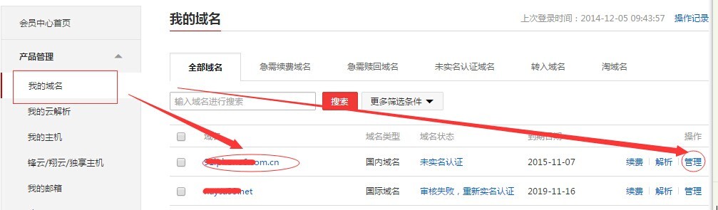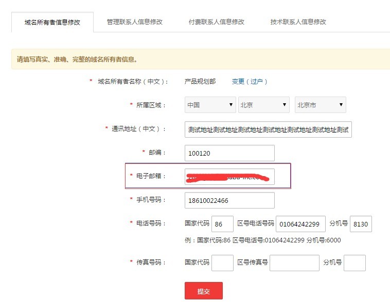 如何修改域名的联系邮箱 1、请您用您的会员账号和密码登录www.net.cn,如下图所示: 2、点击【进入会员中心】; 3、点击【产品管理】--【我的域名】; 4、点击域名右侧的“管理”进入“域名控制台”或者点击要修改信息的域名;如下图所示: 5、点击左侧【域名信息修改】进入“域名所有者信息修改”; 6、把正确的邮箱填写到电子邮箱里面,点击【提交】;如下图所示: 7、确认填写信息是否正确,如果正确请点击【提交】; 8、域名注册联系人邮箱就修改成功了,生效时间是24小时左右。 说明: 1)如果您申请了域名安全锁服务,并处在启用状态,那么就需要先暂停域名安全锁服务,您可以在域名控制台--【安全】--【安全设置】--【域名安全锁】中进行暂停。 2)如果您没有会员账号和密码,但是有域名的密码,您也可以登录http://dc.www.net.cn/login/loginx进行相关操作。如下图所示: 如问题还未解决,请联系售后技术支持。