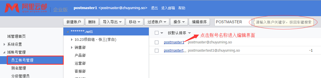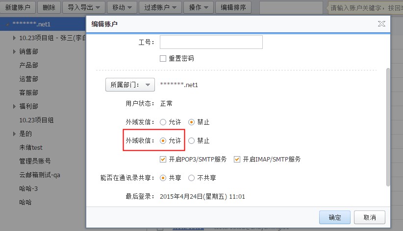 关于企业邮箱无法收信-您暂时无权给此账号发信的情况 企业邮箱如账号A,无法收到外域邮箱的邮件,发件方收取的失败退信中包含如下信息: 退信原因: 您暂时无权给此账号发信。 解决方案: 联系此账号管理员,确认授权后再重新投递。 这种情况是由于邮箱账号没有开通收取外域来信的功能;请参考如下调整开通接收外域邮件的方法: 1、登录postmaster域管理员邮箱,进入【域账号管理】---【员工账号管理】列表中,搜索账号A。如下图所示: 2、在【编辑账户】界面,调整【外域收信】为“允许”,保存即可。如下图所示: 如果问题还未能解决,请联系售后技术支持。 上一条: 企业邮箱web如何移动邮件