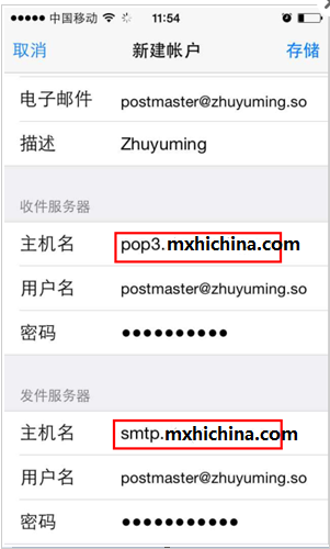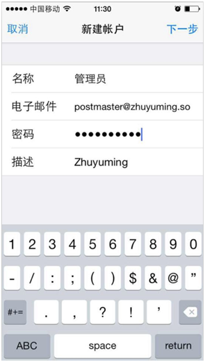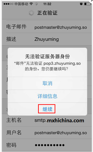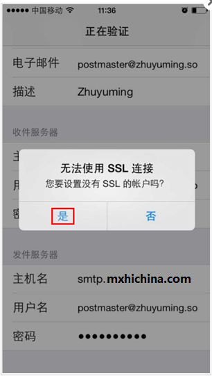 企业邮箱在iPhone5上如何使用设置简介 我们已经推出了自己研制的手机客户端,高兼容性,不需要配置,只需输入企业邮箱地址和密码直接登录使用。 直接扫码下载,如下所示: 下面以iPhone5s(系统版本为ios7)为例,介绍设置苹果系统自带的客户端软件(pop/imap方式)的方法。 温馨提示:我们将使用postmaster@zhuyuming.so为测试案例,请您操作时更换成您自己的邮箱账号和信息。 1、点击系统的”邮件”图标,如图所示: 2、选择帐号类型内的”其他”,如图所示: 3、在新建帐户中,填写邮箱帐号和密码,然后点击“下一步”,如图所示: 4、请您选择使用pop还是imap服务,然后填写您的邮箱帐号和密码和服务器信息,如图所示: 在填写此处时,请您确认您的域名已经做好正确的邮箱解析。 5、选择pop服务,收件服务器填写pop3.您的域名,发件服务器填写smtp.您的域名。 选择imap服务,收件服务器填写imap.mxhichina.com,发件服务器填写smtp.您的域名。如图所示: 6、下一步就是验证,系统会提示建立没有ssl链接的帐号,请选择“是”。 推荐您使用SSL加密连接,更加安全,使用时请注意加密端口465、995、993是否已在您的本地客户端和网络中开放。如图所示: 7、验证通过便可以正常收发邮件了,如果提示您无法验证服务器身份,请选择“继续”即可。如图所示: 上一条: 关于企业邮箱无法收信-您暂时无权给此账号发信的情况 下一条: 关于云邮箱在iPhone4上使用的设置