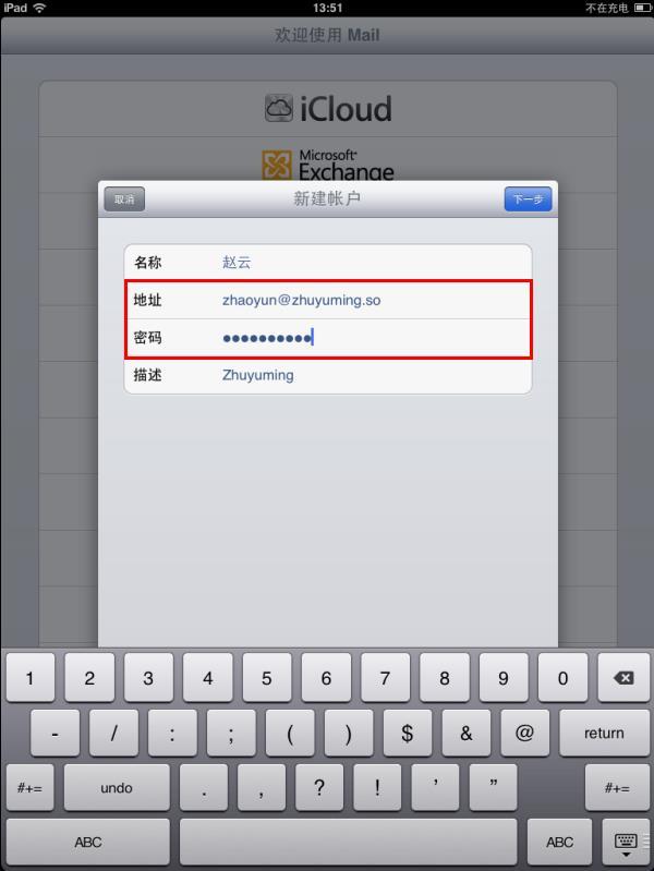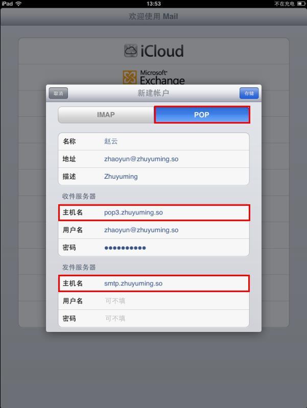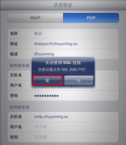 云邮箱IPAD POP3/IMAP协议如何设置概述 随着苹果平板电脑的越来越流行,越来越多的万网邮箱用户选择使用平板电脑来收发邮件,此处以IPAD3(系统版本IOS6.1)为例,介绍下怎么设置苹果IPAD系统自带的客户端软件设置POP3/IMAP协议。 以下我们将使用zhaoyun@zhuyuming.so 为测试案例,请您操作时更换成您自己的邮箱账号和信息。 1、点击系统自带的Mail图标,进入选择邮箱页面,点击“其他”,如下图: 2、在“新建账号”中填写邮箱email地址和密码。点击下一步,如图: 3、选择使用POP或IMAP服务器,填写接收、发送服务器信息,如下图: POP3协议设置 发送邮件服务器:smtp.mxhichina.com或smtp.您的域名,端口25 接收邮件服务器:pop3.mxhichina.com或pop3.您的域名,端口110 IMAP协议设置 发送邮件服务器:smtp.mxhichina.com或smtp.您的域名,端口25 接收邮件服务器:imap.mxhichina.com,端口143 Imap接收邮件服务器协议建议填写:imap.mxhichina.com 推荐您使用SSL加密连接,更加安全,使用时请注意加密端口465、995、993有没有已在您的本地客户端和网络中开放。 4、点击“存储”后,系统将进行验证。系统会提示建立没有ssl链接的帐号,请选择”是”。 注意:这个验证时间会比较长.也可能会因为网络质量原因超时,会多次提醒,还是选择”是”,并请耐心等待。 5、验证完成后,就可以正常收发邮件了。 温馨提醒:如验证无法通过,可以打开“设置”中“邮箱、通讯录、日历”选项,点击已建立的账户,点击“高级”核对接收邮件服务器端口号。如下图: