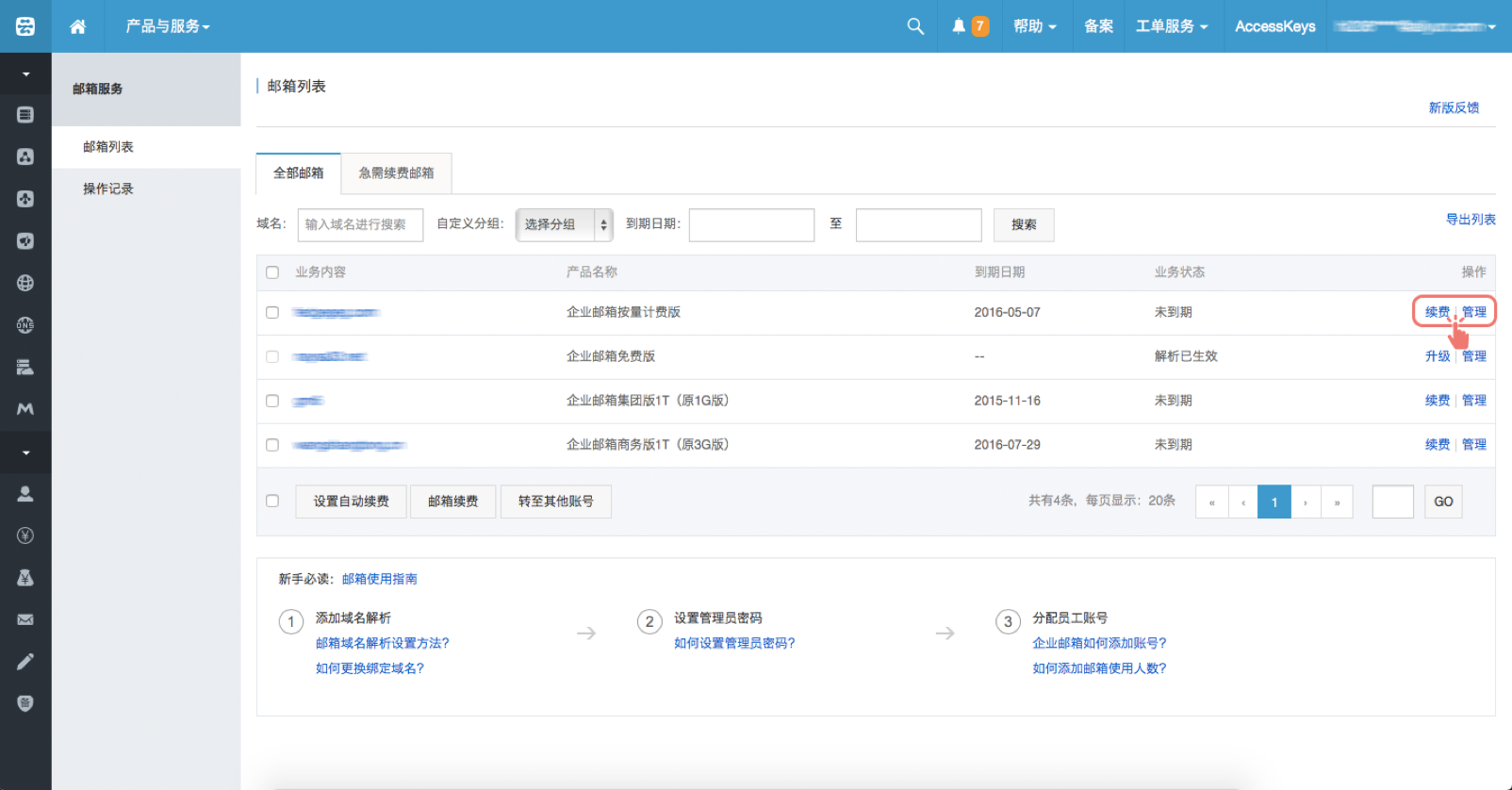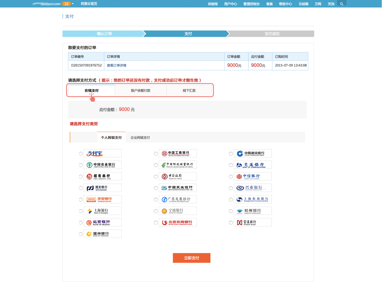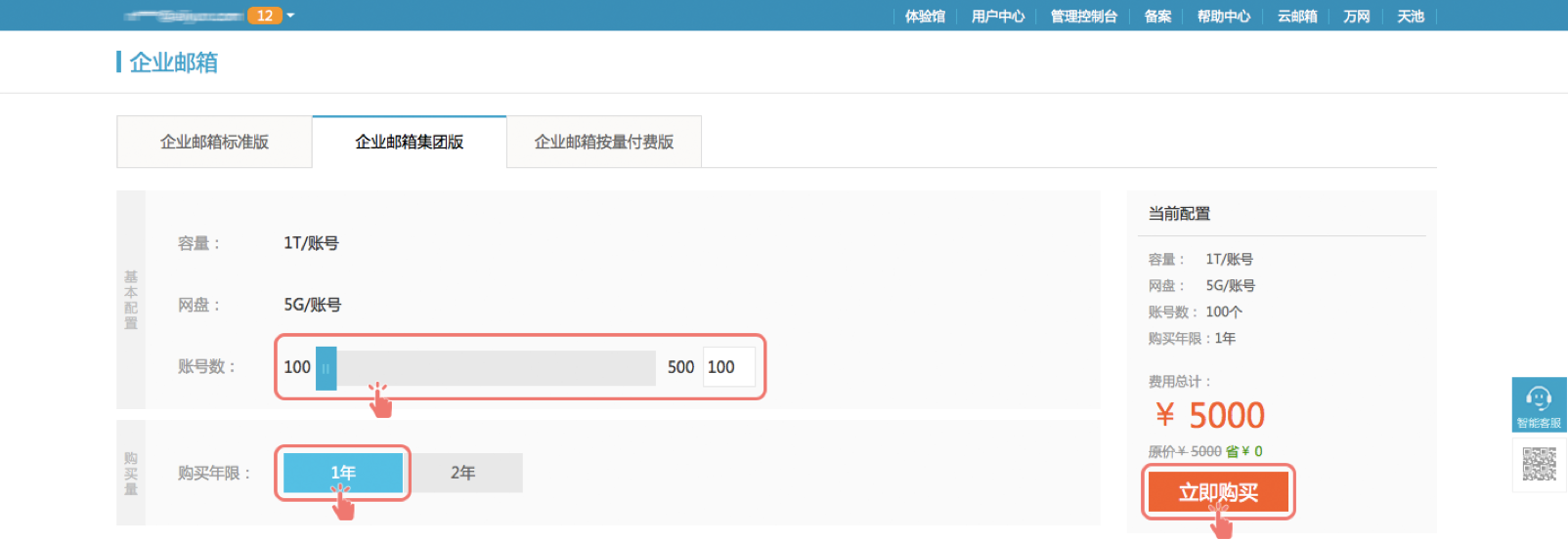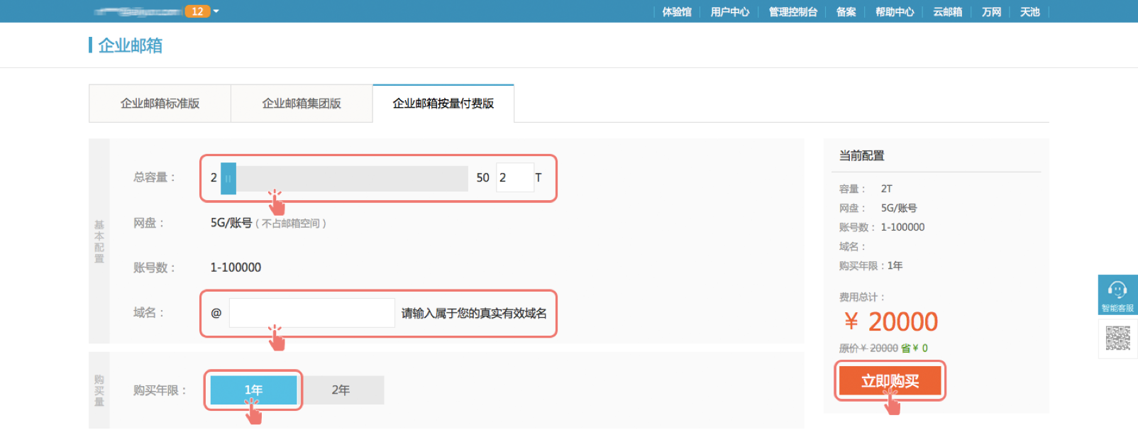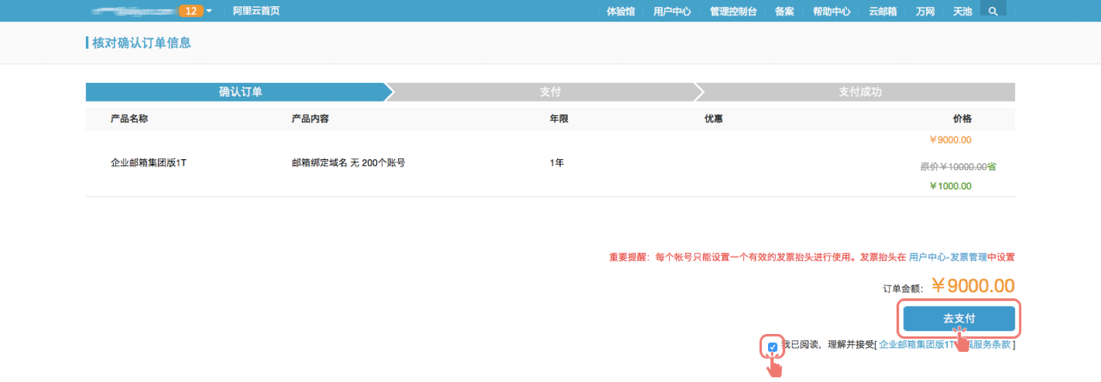 云邮箱购买流程简介 第1步: 如果您已经是阿里云会员,可以直接登录购买。 如果您还不是阿里云会员,那么请先注册成为阿里云会员,注册成功后就可以使用会员信息登录购买企业邮箱产品。 第2步: 登录会员中心,然后进入企业云邮箱频道。如图所示: 第3步:根据您的需求选择您所需要的邮箱版本,查看产品详情,如图所示: A、购买标准版: 1). 选择所需用户数(最小5用户起售)。例如需要购买5个邮箱账户,可以直接在文本框中输入数字5确定;或者拖动滑动条 2). 输入邮箱绑定的域名; 3). 选择购买的年限; 4). 选择完毕后系统会计算出您所选择产品的对应的价格,点击“立即购买”。如图所示: B、购买集团版: 1). 选择所需用户数(最小100用户起售)。例如,需要购买100个邮箱账户,可以直接在文本框中输入数字100确定或者拖动滑动条; 2). 选择购买的年限; 3). 选择完毕后系统会计算出您所选择产品的对应价格,点击“立即购买”。如图所示: C、购买按量计费版: 1). 选择所需邮箱域总容量。例如,需要购买5T容量,可直接在文本框中输入数字5确定或者拖动滑动条; 2). 输入邮箱绑定域名; 3). 选择购买年限; 4). 选择完毕后系统会计算出您所选择产品的对应价格,点击“立即购买”。如图所示: 温馨提醒:按量计费版统一支持10万用户/邮箱域,购买时仅需要选择域总容量就可以了。 第4步: 确认您要购买的产品定单,并确认您理解并且接受企业邮箱服务条款后,点击“去支付”按钮,进入产品购买的结算页面。如图所示: 第5步: 选择支付方式:付款方式有多种,但是推荐通过网银支付。其他付款方式请参考《如何进行线下汇款》 如果您需要申请发票,请您在订单支付完成后,登录会员中心-发票管理进行索取发票,操作方法很简单您可以自行操作哦!请参考《申请发票流程》,如图所示: 第6步: 付费成功后进入“产品管理”,可以查看或者管理您已购买的邮箱产品。如图所示: 如果问题还未能解决,请联系售后技术支持。 上一条: 关于云邮箱绑定域名的一些注意事项 下一条: 企业邮箱(免费版)服务条款简介
