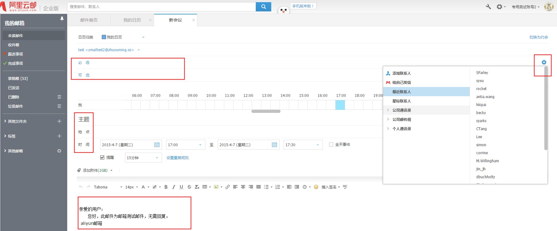 关于web邮箱创建会议邀约的说明 邮箱可以提供会议邀约功能,用户可以在web页面创建会议邀约,具体参考操作方法如下截图: 1、首先点击左下角日历图标进入日历页面: 2、再选择好会议的日期和准确时间点,点击新建日程: 3、然后,输入会议邀请的联系人的地址,可点击右侧加号选择收件人地址、会议主题、地点、时间以及会议内容,再点击发送会议就好了: 如问题还未解决,请联系售后技术支持。 上一条: 集团邮箱做CNAME域名验证必要吗? 下一条: 无下一篇