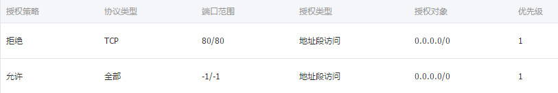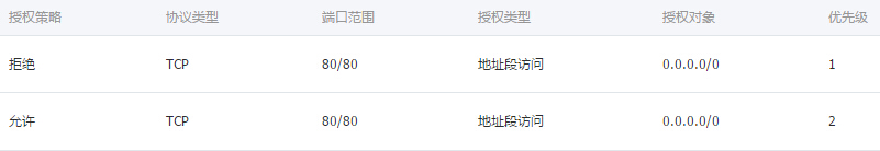 关于阿里云ECS安全组中规则的优先级执行匹配顺序的说明 服务器有至少两个安全组: 1、一台服务器加入到两个安全组中,安全组中规则的优先级相同,如下: 安全组1设置的规则如下: 安全组2设置的规则如下: 排序规则过程分析如下: 先按照安全组显示的顺序排序,也就是安全组1的所有同优先级的优先级在前,安全组2的所有相同优先级排在后。 然后各自按照自己组内的先后顺序,优先级依次是从高到底。 上述案例的最终结果判断顺序如下: 安全组1 1.1.1.3 优先级1 安全组1 1.1.1.2 优先级1 安全组2 2.2.2.2 优先级1 安全组2 1.1.1.1 优先级1 2、一台服务器加入到两个安全组中,安全组中规则的优先级不同,如下: 安全组1设置的规则如下: 安全组2设置的规则如下: 排序规则过程分析如下: 先按照服务器"本实例安全组"中规则排序,即测试案例中的"安全组1"的所有规则在前,"安全组2"的所有规则在后,如下: 安全组1 1.1.1.1 优先级1 安全组1 1.1.1.2 优先级2 安全组2 2.2.2.1 优先级1 安全组2 2.2.2.2 优先级2 然后各自按照优先级排序。 最终安全组规则的判断先后顺序如下: 安全组1 1.1.1.1 优先级1 安全组2 2.2.2.1 优先级1 安全组1 1.1.1.2 优先级2 安全组2 2.2.2.2 优先级2 总结: 一台服务器设置多个安全组后,对于相同优先级的规则,先根据"本实例安全组"中安全组规则的显示顺序排序。对于不同优先级,先判断是否符合"优先级"数字小的规则,如果不符合,再判断是否符合"优先级"数字大的规则。如果没有一条规则匹配到,该访问将被拒绝。 服务器只有一个安全组: 1、两条优先级相同的规则,先判断第一条规则是否符合,不符合的情况下再判断是否符合第二条。比如: 这种情况下访问80端口不通,访问其他端口通。 2、优先级数字小的级别高,数字大的级别低。比如: 这种策略下,访问80端口按照优先级高的规则,也就是级别为1的拒绝访问规则,无法访问到80端口。 总结: 一台服务器只设置一个安全组,按照规则显示的从上到下的顺序,优先级是从高到底。 如果问题还未能解决,请联系售后技术支持。