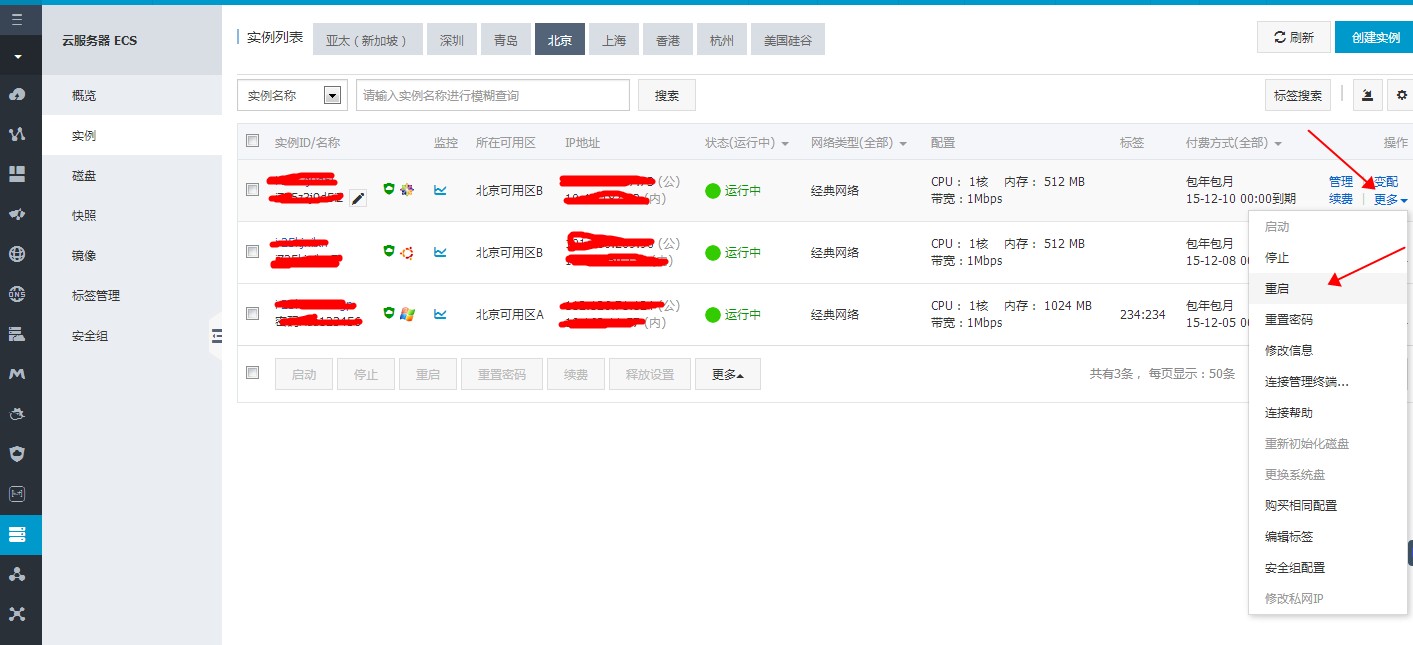 首先登录云服务器管理控制台https://ecs.console.aliyun.com/,然后进入选择ECS 找到您需要重启的服务器实例。点击重启即可。