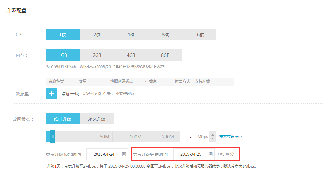2、在打开的页面中,选择”宽带升级结束时间“,比如当前是24日,选择后一天即25日。这样带宽将于 2015-04-25 00:00:00 变回至升级前的带宽。