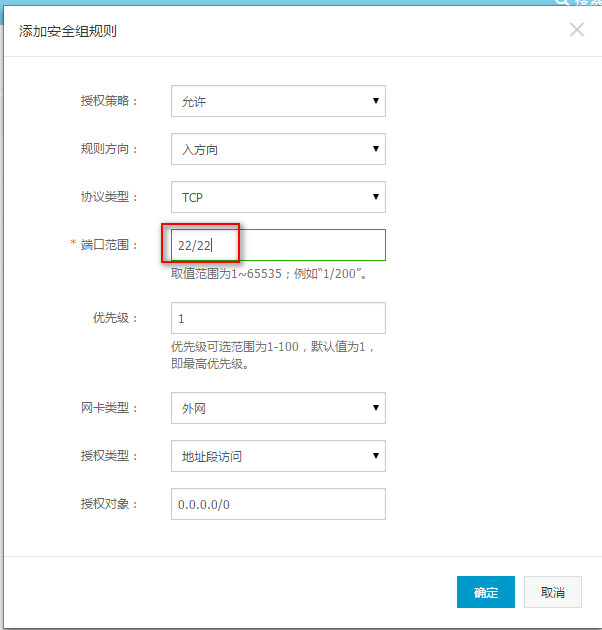 如何正确解决ECS安全组开放端口报“IP协议参数不正确”的问题 问题现象: 在ECS控制台中添加安全组开放22号端口时会报错如下图所示: 问题原因: 出现这种问题是由于操作时,端口填写的格式错误所导致的 解决方法: 正确的配置端口设置,如下图所示: 上面的安全规则,就是对外开放了TCP的22号端口。 注意:端口的正确编写方法是22/22. 如问题还未解决,请联系售后技术支持。 下一条: 如何通过ECS云服务器查看机器的序列号