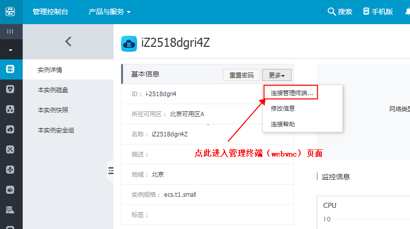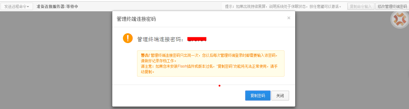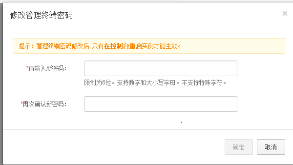 ECS服务器连接管理终端【WebVnc】密码该如何修改 1、登陆www.aliyun.com->【管理控制台】页面进入ecs【实例详情】页面,找到 管理终端 ,如下图所示 : 2、首次打开管理终端后,页面上会显示密码,需要您自行记录备份到您本地保存,再次打开时从系统页面无法查询到该密码,只能修改密码; 警告:管理终端连接密码只出现一次,以后每次管理终端登录时都需要您输入该密码,请做好记录存档工作。 请注意:如果您未安装Flash插件或版本过低,将无法正常使用“复制密码”功能,请您手动复制。 3、当管理终端的密码被忘记时,可以在终端连接页面的右上角 点击 “修改管理终端密码” ; 4、输入您需要设置的密码,终端连接密码限制长度为 6位。仅支持数字和大小写字母,不支持特殊字符; 提示:管理终端密码修改后, 在控制台重启实例新密码才能生效。 5、修改后,需要在管理控制台上重启服务器。服务器内部重启是无效的,重启后密码才能生效。感谢您的支持。 如问题还未解决,请联系售后技术支持 上一条: 如何通过云服务器ECS管理控制台导出所有服务器的信息 下一条: 关于ECS服务器内网的使用说明