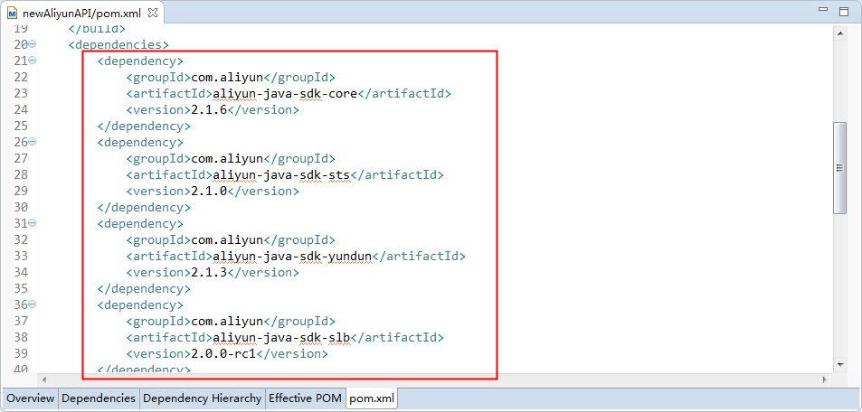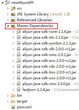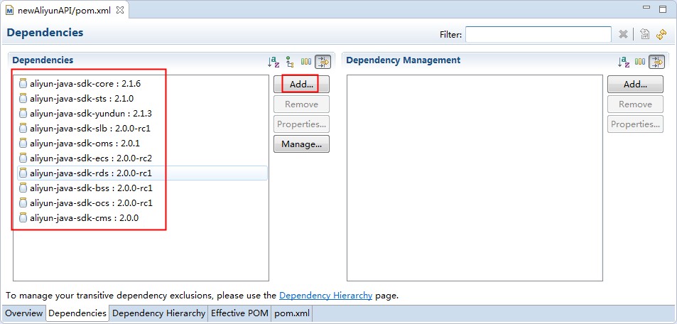 如何下载安装阿里云新版Java SDK 与老版JAVA SDK直接开放下载相比,新版的阿里云JAVA SDK采用了Maven的方式分发,阿里云旗下所有的JAVA SDK都统一在了一个Maven库中,从而方便统一管理。 下载SDK的步骤如下所示(以windows7 64位+Eclipse Luna为例): 1、 下载软件:首先在Maven官方下载页面(http://maven.apache.org/download.cgi)上下载对应操作系统的Maven软件,后方的checksum可供您校验下载文件是否正确无误: 2、 打开JAVA SDK的下载页面:http://develop.aliyun.com/sdk/java,将阿里云的SDK存放的Maven库加入到Maven软件中。找到之前下载好的Maven压缩包,将压缩包解压,将阿里云的maven库信息添加到conf文件夹下的settings.xml中: 3、 在Eclipse里添加一个Maven项目或将已有的项目的项目转换为Maven项目: 4、 打开项目下的pom.xml文件,将Maven的dependency加入到其中,可以通过图形化界面也可以直接编辑pom.xml文件进行添加: 5、 保存之后就可以看到在项目下的Maven Dependencies中自动下载并加入了阿里云的SDK jar包了,即完成了安装。 上一条: 关于ECS服务器内网的使用说明