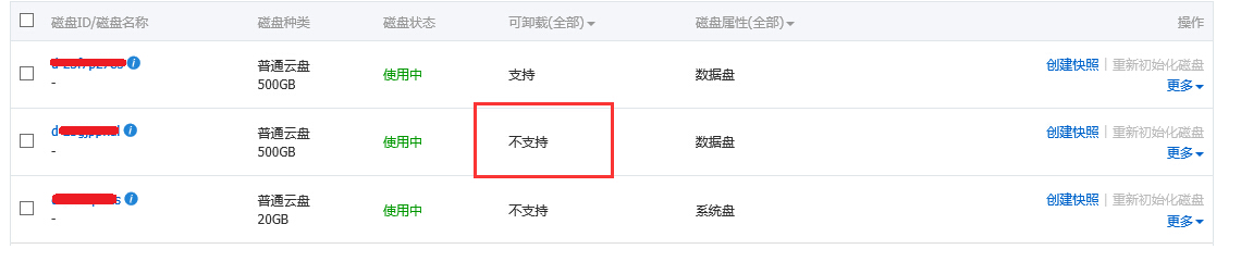 出现该问题是由于早期的云盘(非【独立云磁盘】),不支持卸载操作所导致的。