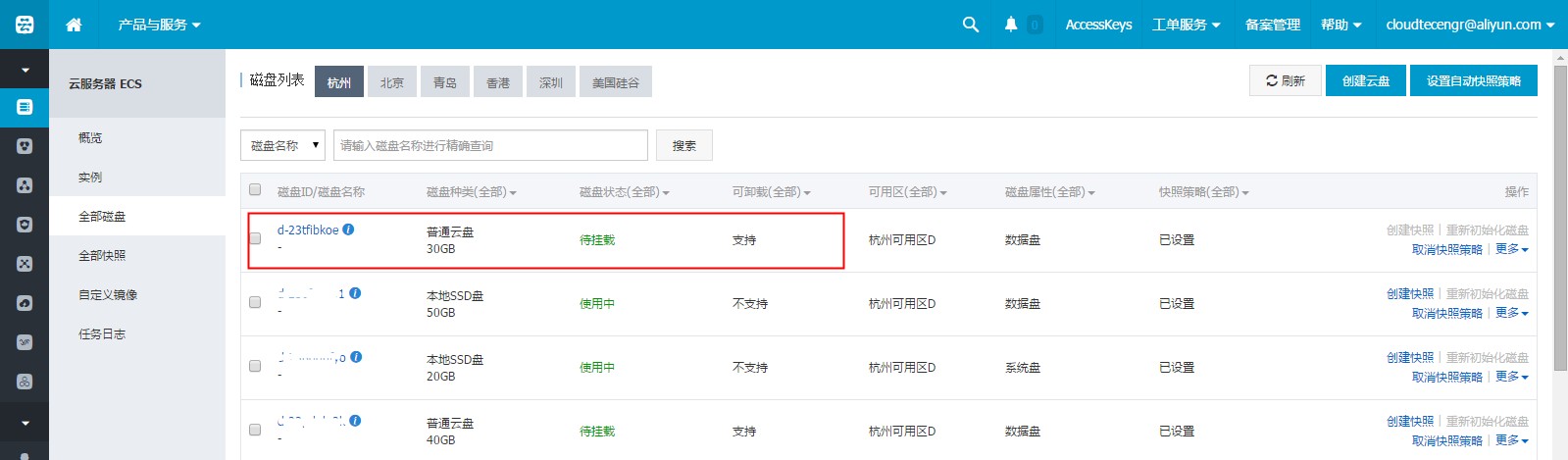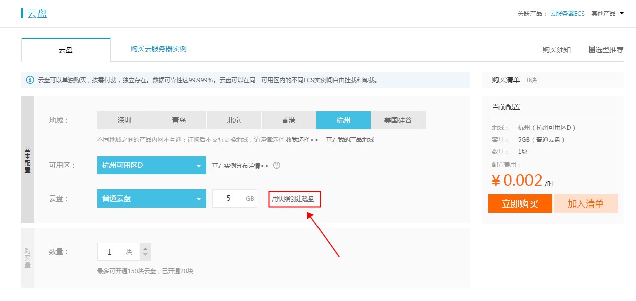 ECS云服务器如何通过快照创建云磁盘来获取快照中的数据 有时不希望通过回滚快照的方式来获取快照中的某些数据时,可以使用云磁盘的“从快照创建云磁盘”的功能,创建后的云磁盘可以挂载到同一区域中的任一台服务器上。步骤如下: 1、首先需要打开ECS控制台页面,找到需要获取数据的快照,复制快照ID。(目前仅支持从数据盘的快照创建) 2、打开云磁盘的购买页面(https://ecs-buy.aliyun.com/#/clouddisk),选择和快照相同的地区,点击“用快照创建磁盘” 3、在弹出的页面中粘贴刚才复制的快照ID,找到对应的快照,确认无误后点击“立即购买”并确认开通。 4、创建成功后请稍等几分钟,在ECS控制台的“全部磁盘”页面就可以看到刚刚创建的云磁盘,磁盘的大小与快照相同,处于待挂载状态。 5、然后点击列表最右边的“更多”->“挂载”,在弹出的页面中填入需要挂载的服务器实例ID,并选择挂载点。 6、成功挂载后就可以通过服务器内来获取源快照中的数据了,linux用户可使用mount命令来挂载云磁盘,Windows用户在系统中可以直接看到新增的云磁盘。 如果问题还未能解决,请联系售后技术支持。