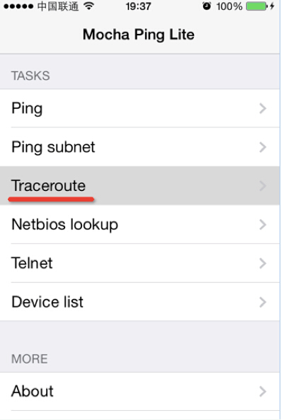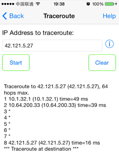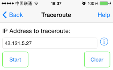 阿里云ECS手机移动端网络路由的跟踪探测方式 在使用移动网络访问服务器中的服务时,如果存在网络异常,可以通过以下方式进行定位: 1、首先获取手机移动端的本地公网IP地址 在手机端打开浏览器,访问网站 http://ip.cn,在返回的结果中即可看到用户手机的公网IP地址。 2、获取手机移动端到用户访问的网站的路由跟踪结果 根据移动端的系统不同,Android和iPhone IOS,获取方式分别如下详细介绍。 Android系统路由跟踪探测方式: (1)首先安装软件Traceroute,可以通过百度手机助手、360手机助手、豌豆荚或者用户手机中的应用市场等来安装。 (2)配置Traceroute: a、打开Traceroute软件后出现下面的界面: b、然后按手机下方右侧的三横键,也就是用户手机的菜单键,出现下图界面后选择"Options": c、选择后会出现如下界面: d、然后取消"Enable DNS"的勾选,最后点击"Traceroute method"菜单,会看到如下所示: e、选择"ICMP",选择后回返回刚才的菜单界面,配置操作就完毕了。最后选择”返回”键即可返回该软件主界面。 (3)进行路由跟踪探测: 输入所要访问的云产品的IP地址,点击"Trace",然后等到执行完毕后截屏,最终结果如下: iPhone IOS路由跟踪方式: (1) 首先安装软件Network Ping Lite,可以通过App Store下载。 (2) 打开Network Ping Lite软件后出现下面的界面: (3)选择"Traceroute"即进入路由探测界面: (4)在地址栏里输入所要访问的云产品的地址,然后点击"Start"即可开始探测,结束后截图如下: 如果问题还未能解决,请联系售后技术支持。 上一条: 阿里云服务器常见默认端口服务及作用说明