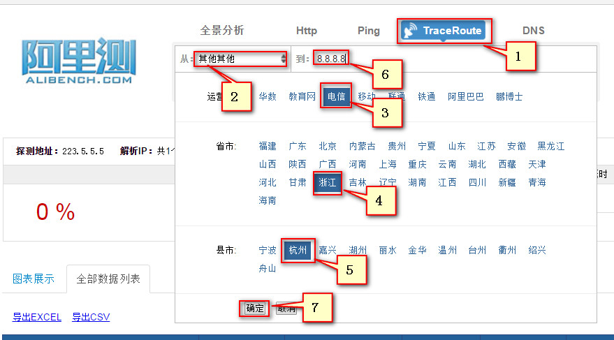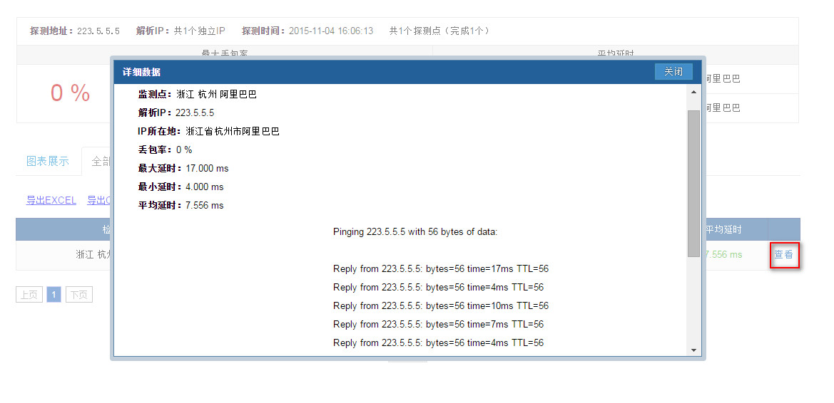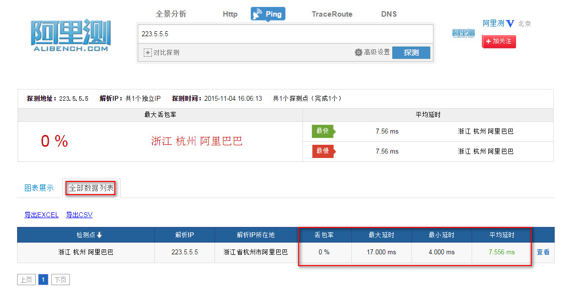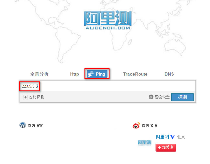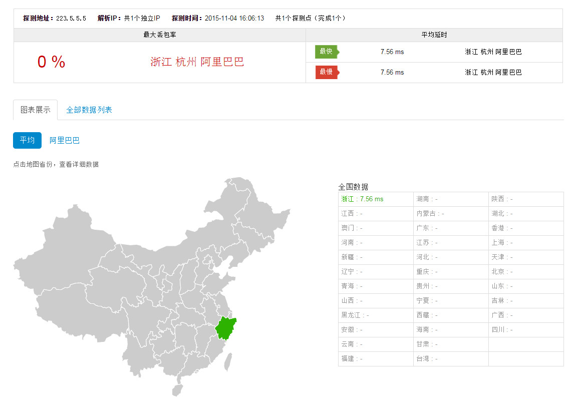 阿里测的使用 使用阿里测可以对IP地址,网站地址进行测试,这个可以让服务器管理员或者网站管理员了解到自己的服务器在全国的可访问情况,以及延时情况。 阿里测地址:www.alibench.com 一,IP测试: Ping 测试 例如测试到IP:223.5.5.5 可以测试全国的情况: 测试某个区域的情况: 在使用中会出现在某个区域无法Ping通的情况,这个时候就需要测试某个区域的ping 情况。 首先需要确认,是那个区域的用户,此时需要先确认不能Ping过来的IP地址是多少。 查看用户当前使用公网IP,可以让用户登陆ip.taobao.com来查看。 可以看到,当前用户IP是:42.120.74.183 然后可以测试人员可以在PC上登陆ip.taobao.com查看到这个IP的所在区域和网络运营商。 可以看到IP所在的区域是:浙江省杭州市 网络运营商是:阿里巴巴 确认区域和网络运营商后,就可以针对区域做测试: 可以看到ping 过来的丢包率,延迟情况。 点击【查看】,就可以看到具体的Ping情况。 二,网站访问测试 可以用来测试网站在全国或者某个区域的访问情况,方法和IP测试一致,就不在赘述具体的操作,以下给出测试示例: 可以通过上图看到,淘宝网在全国的访问情况,包括能否访问到,以及访问的耗时。 可以看到全国的访问情况,同时可以把访问的数据导出到本地成excel表格和csv文件。 当然也是可以测试某个区域访问网站的情况: 例如,测试上海访问淘宝网的情况。 三,路由测试 如果出现ping 不通或者Ping的丢包或者延时大的情况,需要做traceroute,这个时候可以使用阿里测来模拟全国过来的检测情况。 例如: 测试从浙江杭州电信到8.8.8.8的路由情况。 可以看到过去的详细路由情况。这个traceroute能够看到路由情况,但是看不到到每一跳的延时情况,所以对于Ping 某个地址延时过大的问题排查没有太大的意义。 上一条: ECS网卡支持队列吗 下一条: 阿里云ECS 掩码的表示方法