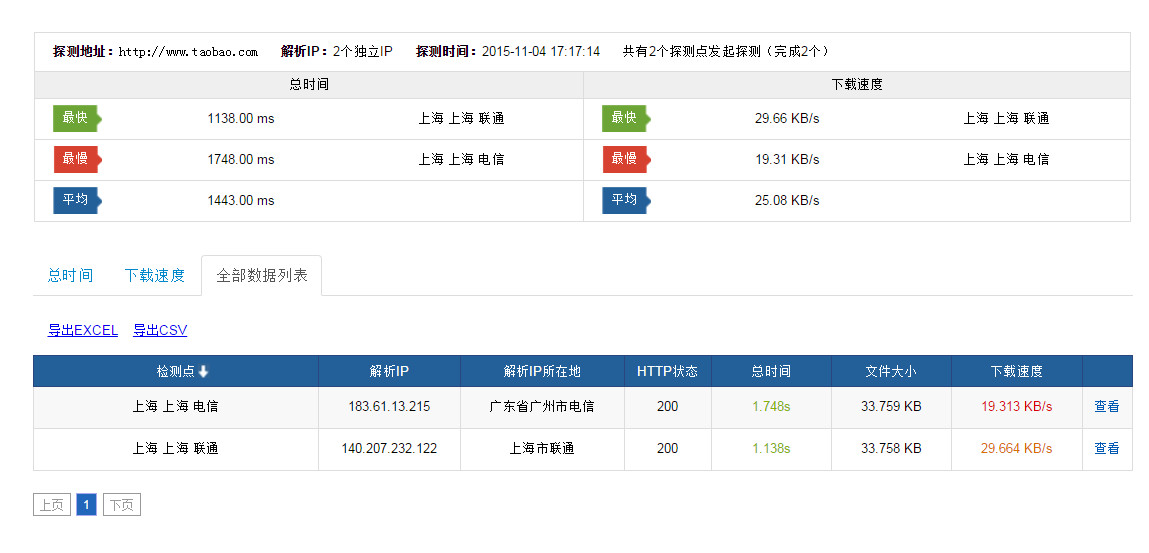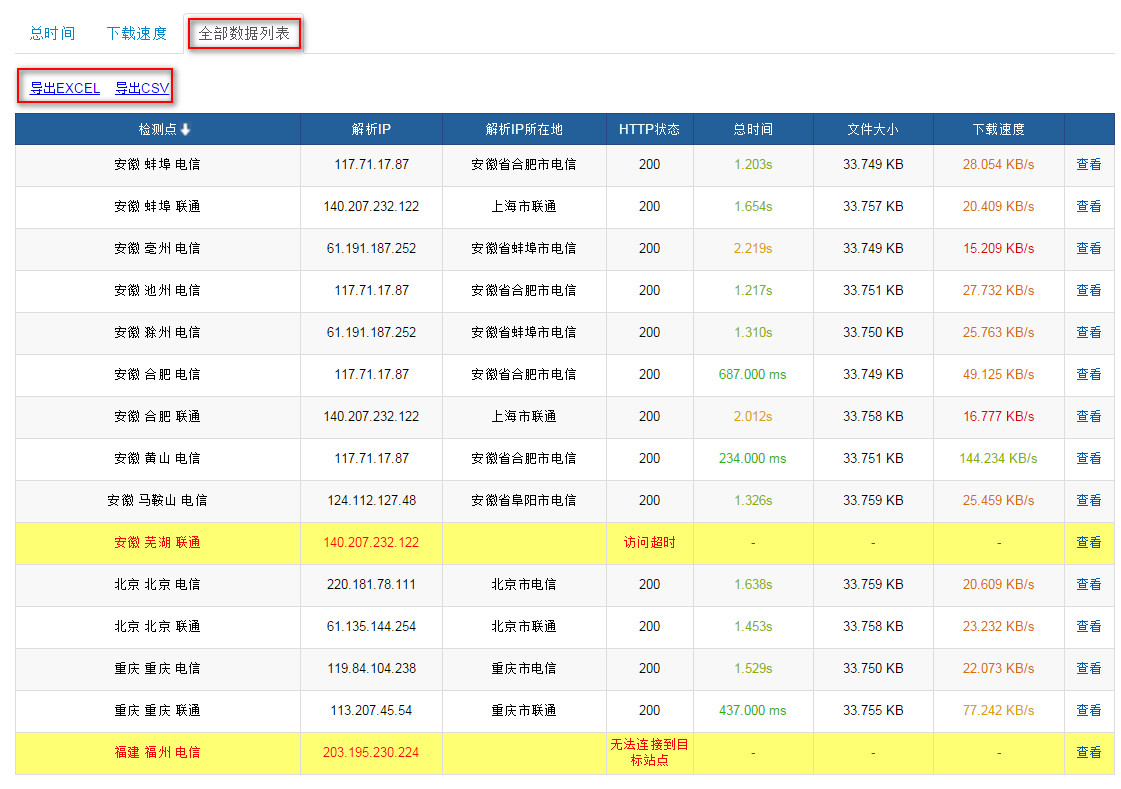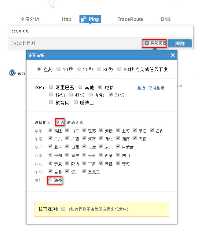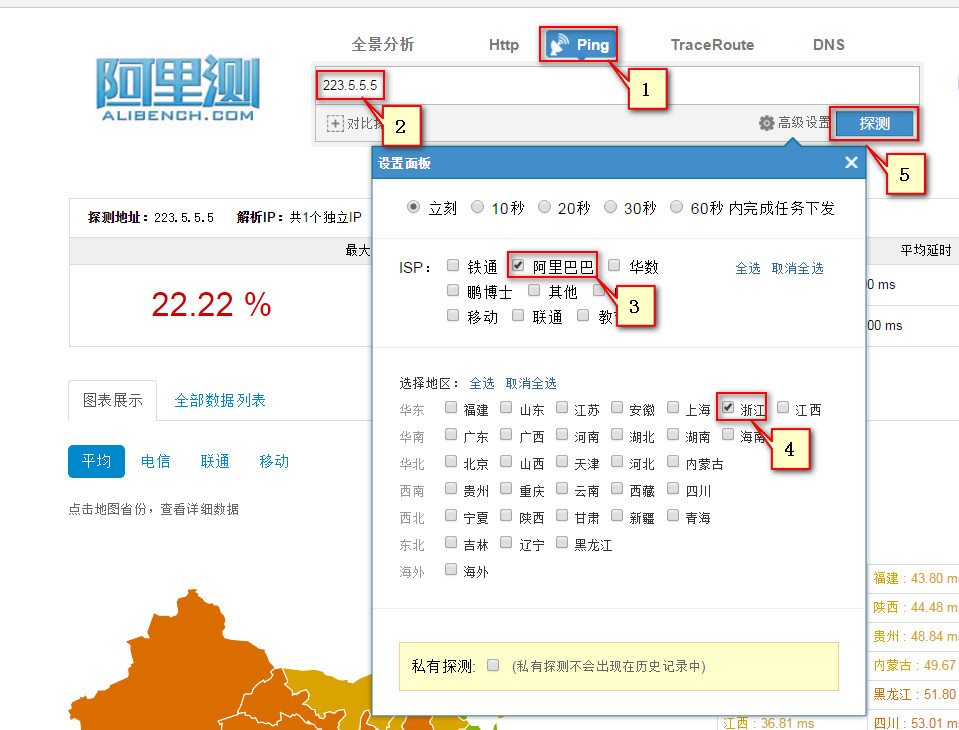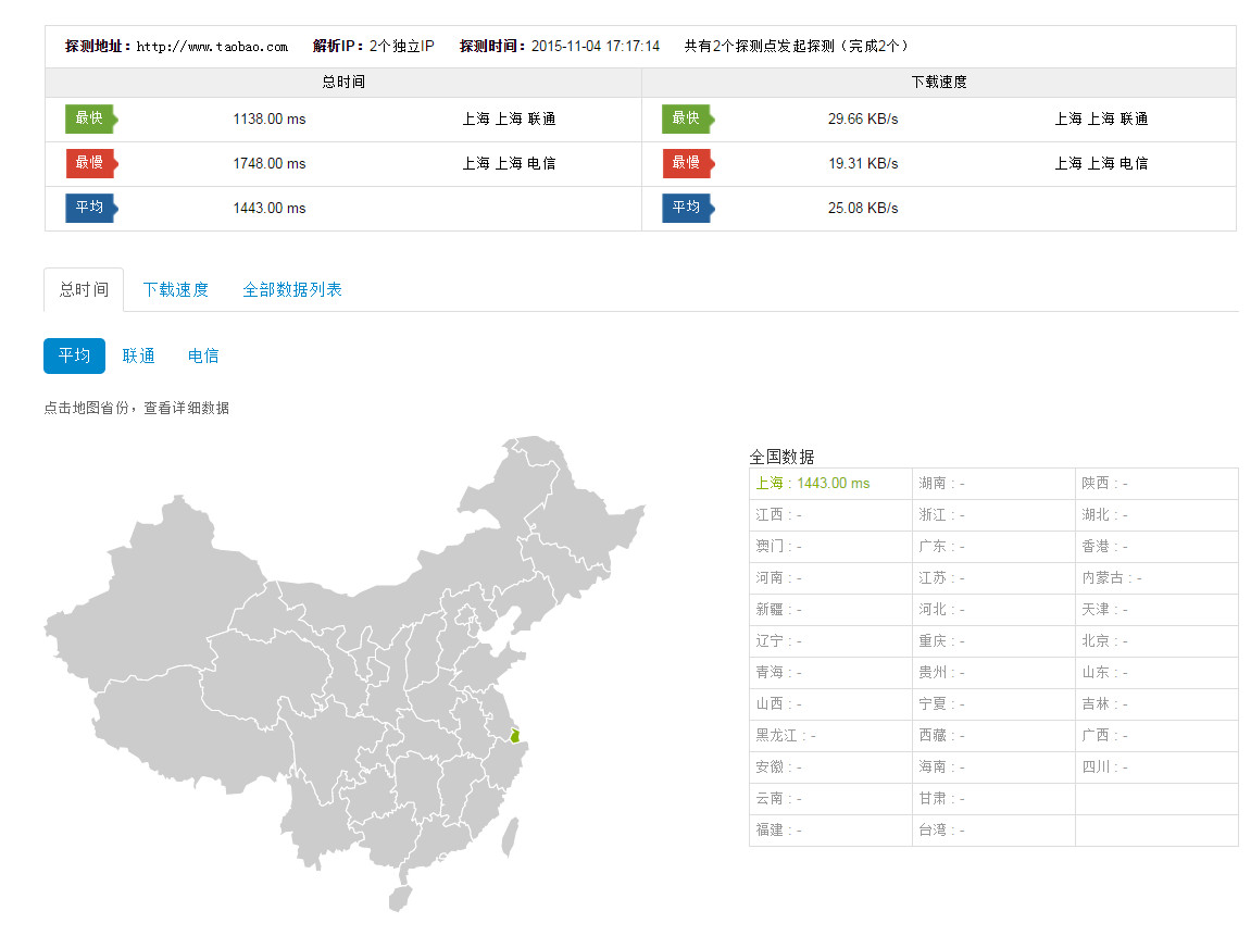 阿里测的使用 使用阿里测可以对IP地址,网站地址进行测试,这个可以让服务器管理员或者网站管理员了解到自己的服务器在全国的可访问情况,以及延时情况。 阿里测地址:www.alibench.com 一,IP测试: Ping 测试 例如测试到IP:223.5.5.5 可以测试全国的情况: 测试某个区域的情况: 在使用中会出现在某个区域无法Ping通的情况,这个时候就需要测试某个区域的ping 情况。 首先需要确认,是那个区域的用户,此时需要先确认不能Ping过来的IP地址是多少。 查看用户当前使用公网IP,可以让用户登陆ip.taobao.com来查看。 可以看到,当前用户IP是:42.120.74.183 然后可以测试人员可以在PC上登陆ip.taobao.com查看到这个IP的所在区域和网络运营商。 可以看到IP所在的区域是:浙江省杭州市 网络运营商是:阿里巴巴 确认区域和网络运营商后,就可以针对区域做测试: 可以看到ping 过来的丢包率,延迟情况。 点击【查看】,就可以看到具体的Ping情况。 二,网站访问测试 可以用来测试网站在全国或者某个区域的访问情况,方法和IP测试一致,就不在赘述具体的操作,以下给出测试示例: 可以通过上图看到,淘宝网在全国的访问情况,包括能否访问到,以及访问的耗时。 可以看到全国的访问情况,同时可以把访问的数据导出到本地成excel表格和csv文件。 当然也是可以测试某个区域访问网站的情况: 例如,测试上海访问淘宝网的情况。 三,路由测试 如果出现ping 不通或者Ping的丢包或者延时大的情况,需要做traceroute,这个时候可以使用阿里测来模拟全国过来的检测情况。 例如: 测试从浙江杭州电信到8.8.8.8的路由情况。 可以看到过去的详细路由情况。这个traceroute能够看到路由情况,但是看不到到每一跳的延时情况,所以对于Ping 某个地址延时过大的问题排查没有太大的意义。 上一条: ECS网卡支持队列吗 下一条: 阿里云ECS 掩码的表示方法