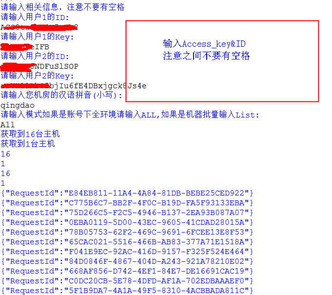 阿里云ECS跨用户内网互通的操作说明(Python版) 如果用户名下有多个账户,或者名下ECS与其它用户ECS有内网互通需求,此时就需要进行跨用户内网互通操作。 用户可以参阅下面所述工具和操作说明,自助完成ECS跨用户内网互通(安全组配置)操作。 注意事项: 跨用户内网互通目前还受地域限制,只支持同地域实例间的配置(可以是不同可用区); 这个脚本是基于Python编写的。如果想要在Windows下使用,需要先安装配置Python环境(Linux环境下已自带); 操作说明: 1、首先下载工具脚本:内网打通工具.zip 2、获取两个待操作用户的【Access Key】,操作说明请参阅该文档。 3、切换到Get_info.py所在目录后,使用如下指令执行脚本: python Get_info.py 4、依次输入两个待操作用户的Access Key信息,如下图所示; 5、接着输入待操作地域信息小写字母汉语拼音(注意全部为小写字母)。 支持的地域信息如下: beijing hangzhou shenzhen qingdao hongkong 6、选择操作模式: 如果输入【ALL】,则会自动将两个账户下相应地域的所有实例完成互通配置; 如果只需要打通部分实例,则按照提示,分别输入两个账户下相应的实例列表即可。格式是以单引号包围、逗号分隔,形如:'i-******',i-******','AY************662d06'。 如问题还未解决,请联系售后技术支持。 上一条: 如何检查ECS云服务器CPU以及内存异常