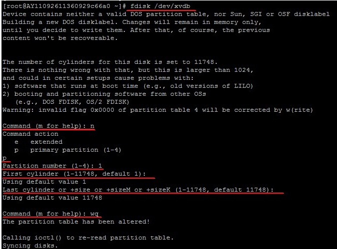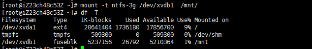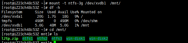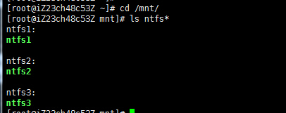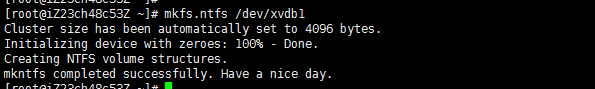 2、分区格式化磁盘 执行“fdisk /dev/xvdb”命令,对数据盘进行分区; 根据提示,依次输入“n”,“p”“1”,两次回车,“wq”,分区就开始了,很快就会完成。 3、格式化磁盘 #mkfs.ntfs /dev/xvdb1 4、挂载磁盘写入测试数据(测试数据是ntfs1-3,为了验证可以在Windows主机下可以正常显示) mount -t ntfs-3g /dev/xvdb1 /mnt/