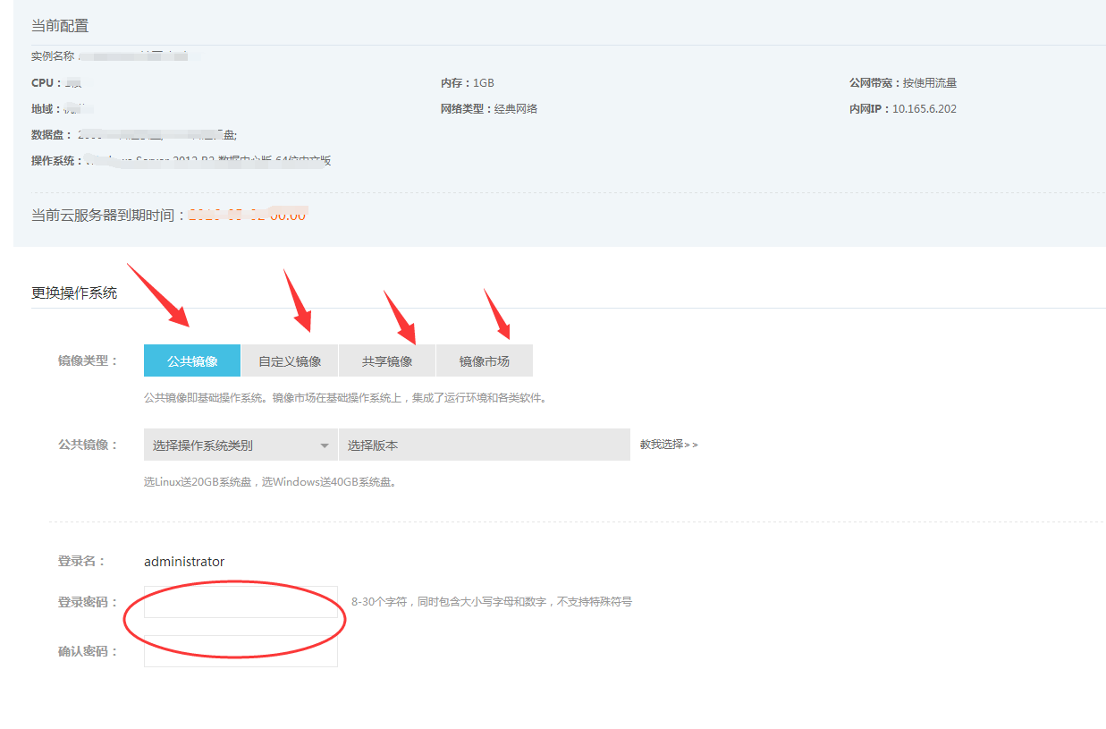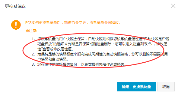 阿里云ECS如何更换系统盘 重要提示: 1、您可以对您的ECS实例更换系统盘,来达到更换操作系统的目的,更换系统盘这个操作只有在极少数情况下进行,更换系统盘后原系统盘上的数据将被全部清除掉,请您谨慎操作, 2、进行更换系统盘需要您的ECS实例处于停止状态,因此会中断您的业务,并且您的业务运行环境需要在新的操作系统中重新搭建,这个操作有可能会对您的业务造成长时间的中断,但更换系统盘不会更改您ECS实例的IP地址。 3、在做跨平台的操作系统更换的时候需要注意数据盘的文件格式会无法识别:linux 更换操作系统至windows 会导致windows系统默认无法识别ext3,ext4,xfs等文件系统格式的磁盘,需要您单独安装软件识别,例如 ext2read ext2fsd 等。windows 更换系统至linux 会导致linux默认无法识别NTFS格式,需要您单独安装软件识别,例如ntfs-3等。 登录ECS管理控制台--【实例详情】--先停止服务器,在【配置信息】模块选择--【更多】--【更换系统盘】 具体操作可以参考下图: 点击后会出现提示,是更换系统盘的重要提示,请看完提示,确认无误后再操作,如下图所示: 【确定】后会有更换的镜像选择,并且 需要设置管理员密码,如下图所示: 选择对应的系统确定记录,管理控制台可以观察下系统状态,正常需要10分钟左右的时间就可以完成更换, 公共镜像指的是阿里云推出的镜像系统,没有配置任何的程序与环境, 共享镜像指的是其它账号所共享的镜像, 自定义镜像指的是用户自行在管理控制台创建的镜像, 镜像市场镜像指的是第三方提供的镜像,集成了某些环境, 如果问题未解决,可以联系阿里云售后支持 下一条: 已有的ECS如何更换云市场中的镜像