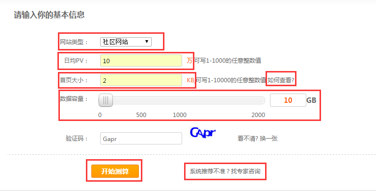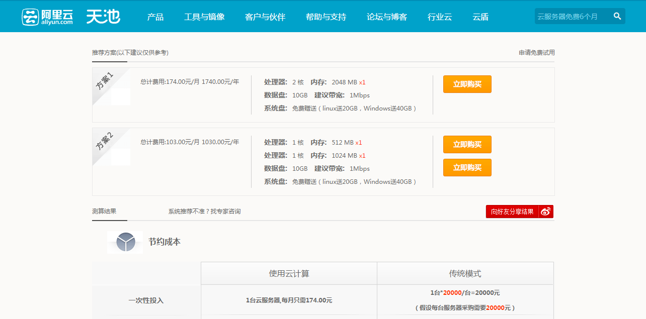 如何购买合适类型的ECS 当为ECS购买选型,用户可以通过阿里云网站提供的选型工具进行预估选型。 1. 选型工具地址:http://www.aliyun.com/promotion/bijia?spm=5176.6883001.8001.12.Zg8Ldk 2. 输入网址的基本信息:网址类型、首页大小、日均PV、数据容量,完成后输入验证码点击“开始测算”就可以查看结果了。 测算结果如下图所示,仅供参考: 如问题还未解决,请联系售后技术支持。 上一条: 关于云服务器带宽流量计费