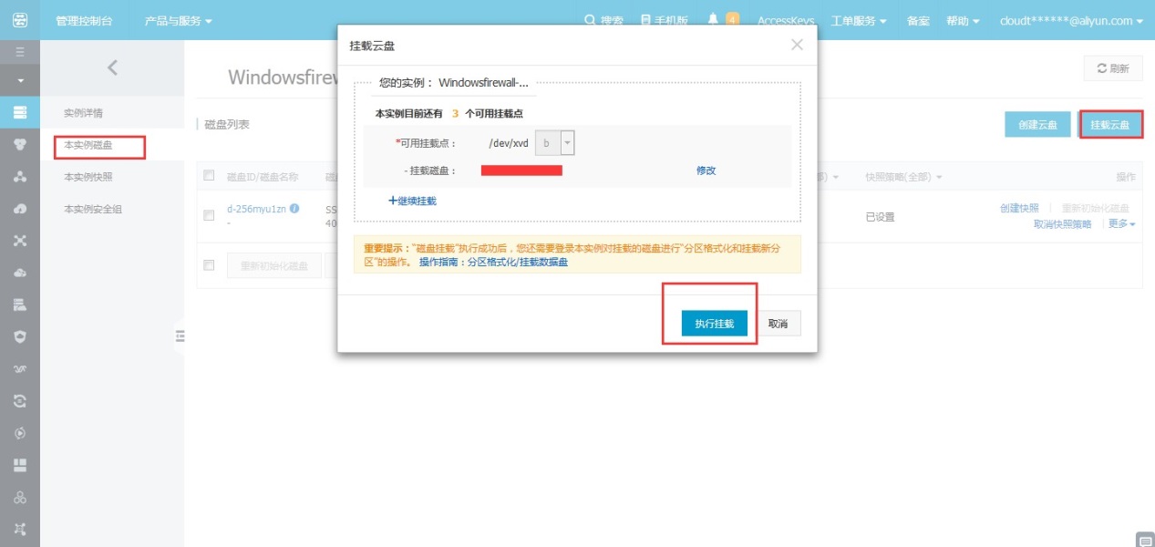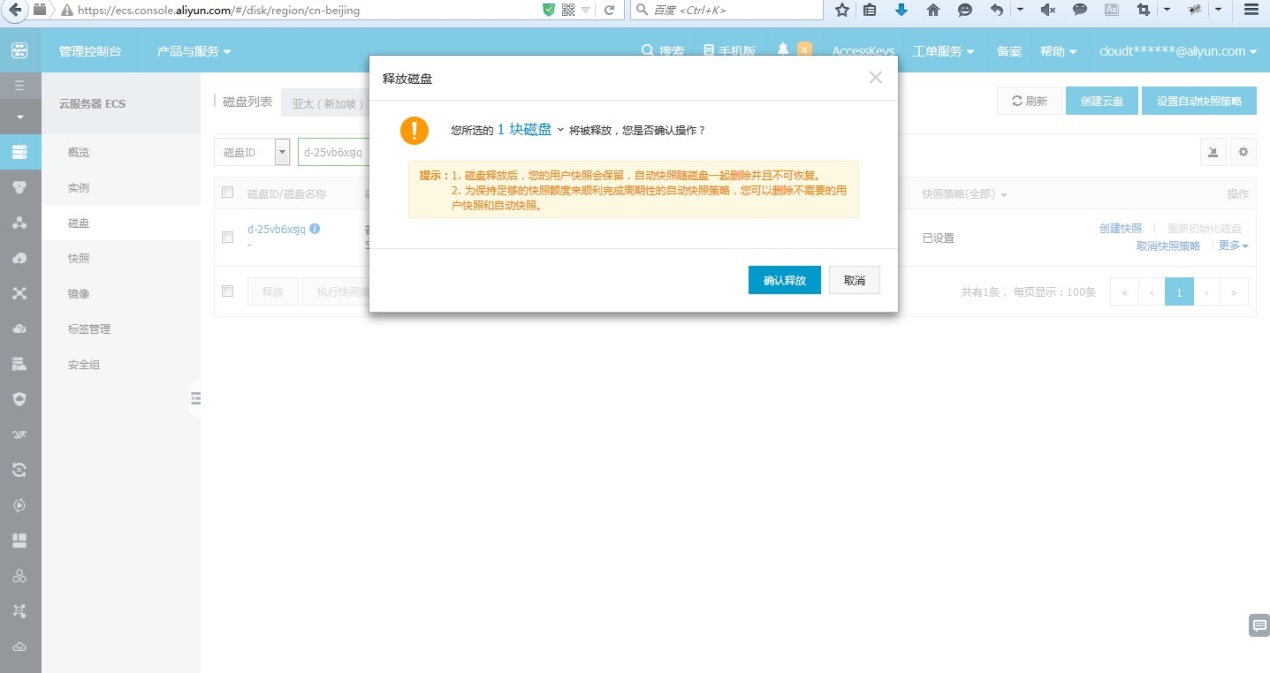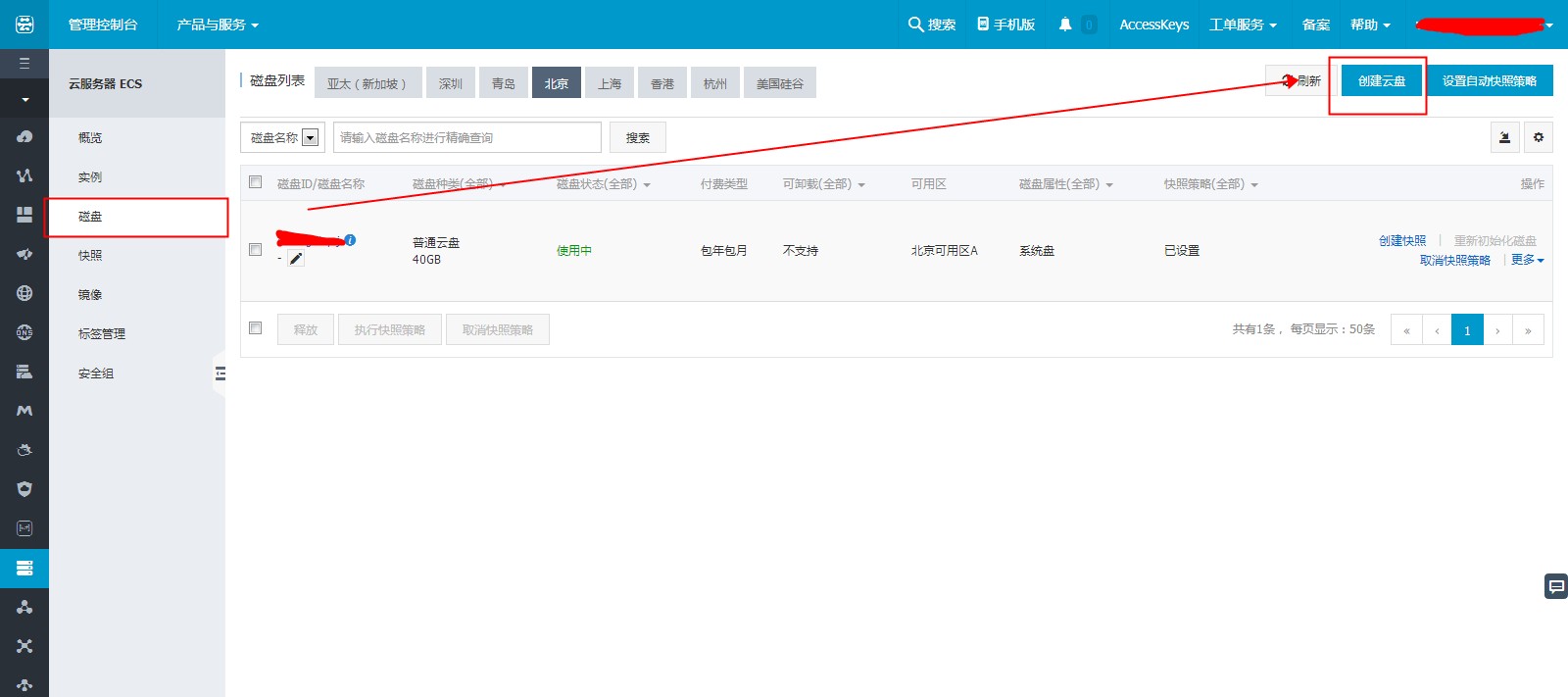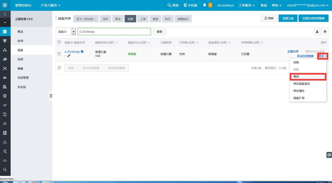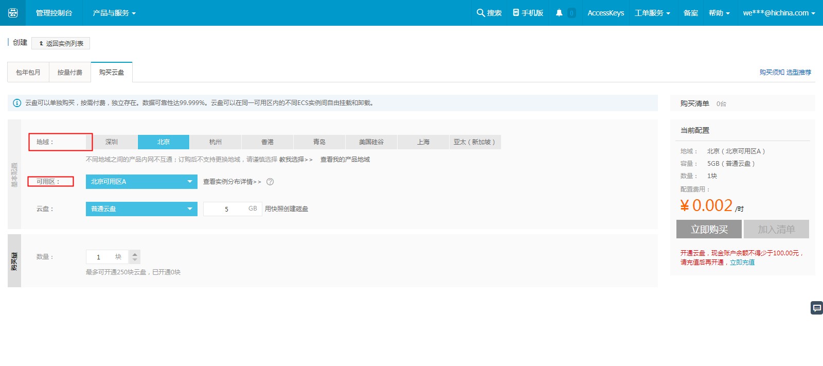 需要注意的是购买的数据盘要和服务器在同一个可用区,如果数据盘购买错误,可以通过主机管理控制台释放,再重新购买