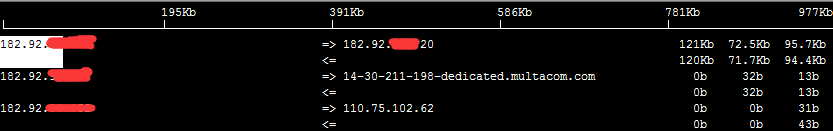 Linux中查看网卡流量工具的有iftop、iptraf及nethogs等,iftop可以用来监控网卡的实时流量(可以指定网段)、反向解析IP、显示端口信息等。 安装iftop的命令如下所示: Debian/Ubuntu系统为“apt-get install iftop” CentOS系统为“yum install iftop -y” 常用参数说明: -B 以Byte为单位显示流量(默认是bits),如:# iftop -B -F显示特定网段的进出流量,如# iftop -F 182.92.***.0/24或# iftop -F 182.92.***.0/255.255.255.0 -i设定监测的网卡,如:# iftop -i eth1,其中eth1是服务器的公网网卡,(网卡名称可以通过ifconfig查看),结果如下两图所示: 如:iftop -i eth1 -B -F 182.92.***.20 显示182.92.***.20这个IP与服务器的网卡eth1交互的数据量,单位是Byte。 界面说明: "<="与"=>",表示的是流量的方向 "TX":从网卡发出的流量 "RX":网卡接收流量 "TOTAL":网卡发送接收总流量 "cum":iftop开始运行到当前时间点的总流量 "peak":网卡流量峰值 "rates":分别表示最近2s、10s、40s 的平均流量 可以通过键盘的"q"键退出iftop 案例说明: 在ECS控制台的资源监控详情查看服务器带宽利用率异常时,可以对上述结果中一直与服务器存在数据交互的IP进行排查 假如在ECS中查看到带宽跑满,通过iftop查看到上述的182.92.***.20这个IP占用的流量较高,如果是异常的IP,可以通过iptables将其屏蔽:iptables -A INPUT -s 182.92.***.20 -j DROP