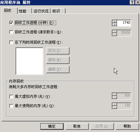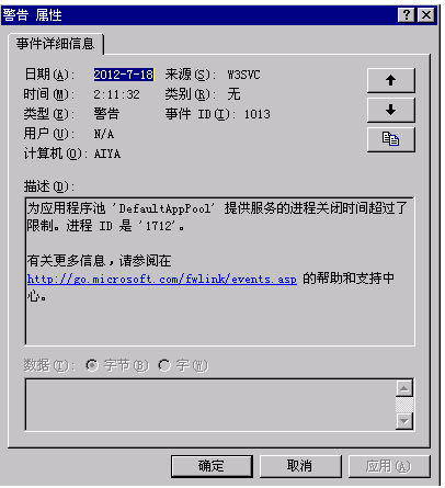 如何解决ECS Windows服务器IIS的应用程序池'DefaultAppPool'导致IIS假死的问题 问题现象描述: 安装IIS服务时,经常出现异常导致无法启动,事件管理器记录的信息如下图所示: 解决方法: 右击-》应用程序池 'XXXXXXX',如果使用的是'DefaultAppPool'就使用右击'DefaultAppPool',选取-》属性: 具体的设置如下所示: 1、回收工作进程(分钟):选中,值为1740, 2、回收工作进程(请求数目):不选(原先设置为35000), 3、消耗太多内存,实时观察下内存的使用,日志是否有记录内存不足的记录,如果内存不足用户可以尝试内存升级。 如果问题还未能解决,请联系售后技术支持。