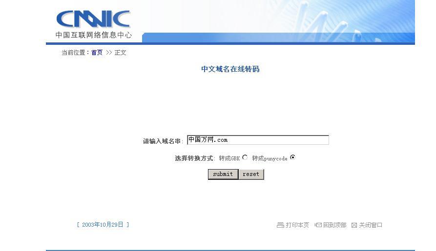 Web服务器如何绑定中文域名 绑定前首先需要有一个已注册并可用的中文域名,如“中国万网.com”,然后还需要找到这个中文域名的转码才可进行绑定。 中文域名的转码可以登陆到http://www.cnnic.cn/jczyfw/zwym/zgymzcjsy/201206/t20120612_26523.htm ,输入要转码的中文域名转码为punycode编码。如下图所示: 点击submit就可以看到转码了 然后将转码后的域名按照普通的域名操作方式,配置域名绑定就可以了。