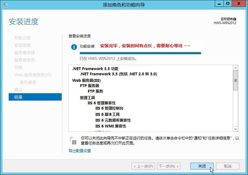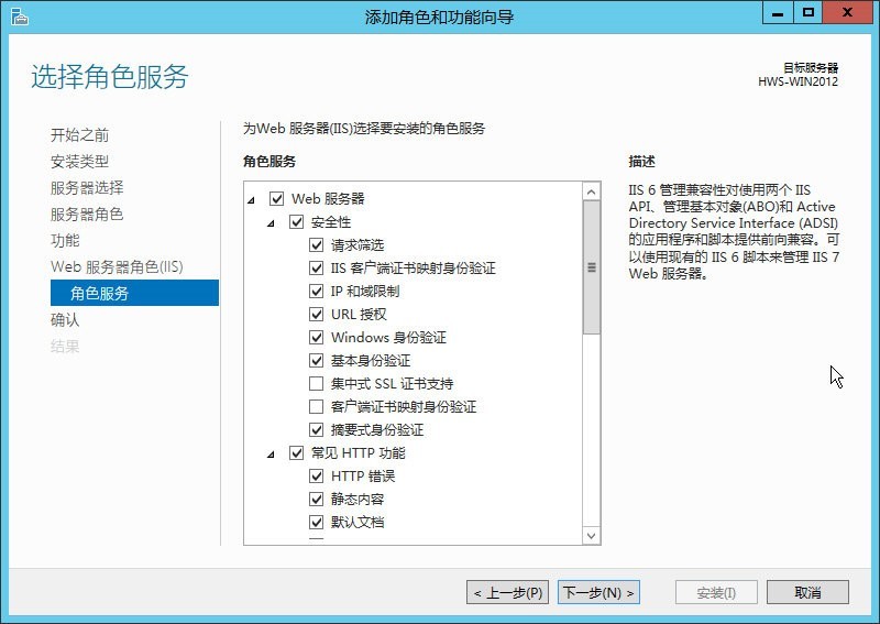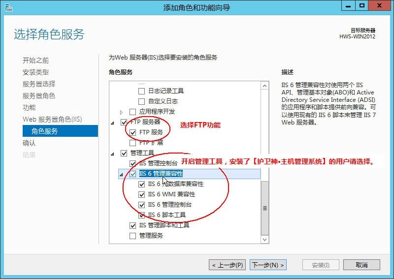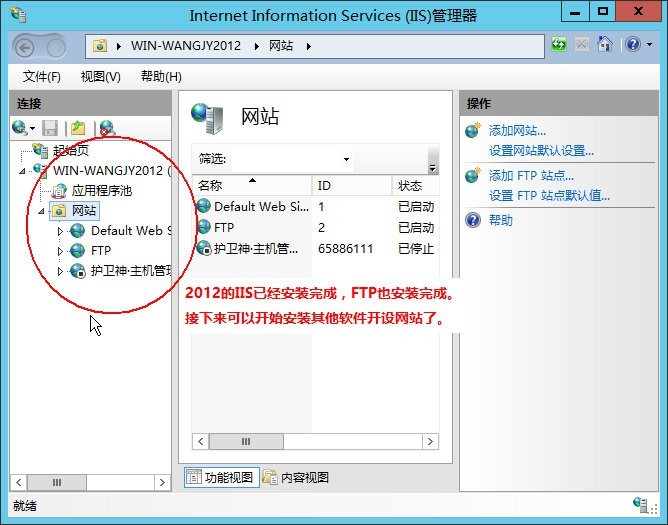 阿里云Windows2012安装IIS和FTP方法 步骤如下所示: 1、首先打开Windows 2012的服务器管理器,然后选择管理→添加角色和功能; 2、进入添加角色和功能向导,选择 “Web服务器(IIS)”; 3、然后根据情况选择对应功能,这里用户选择.Net3.5; 4、安装角色服务,选择对应的安全性选项,如下图所示: 5、选择“FTP服务器”,以及开设主机必须要用的“管理工具”,此项非常重要: 6、然后等待安装,时间有点长,耐心等待就可以了; 7、安装完毕,打开IIS管理器查看,如下图所示: 8、打开了IIS管理器,看到程序池,站点,至此,在Windows2012下安装IIS就已经成功了。