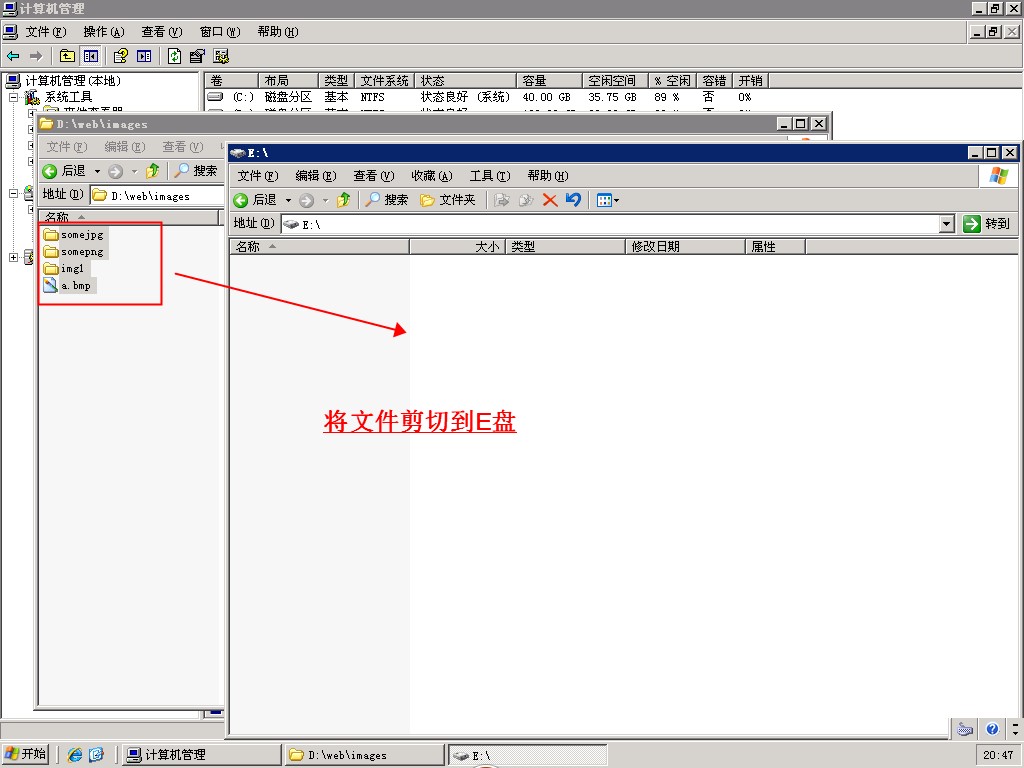 ECS Windows在不修改网站设置的情况下如何使用新数据盘 在用户的实际应用中,有可能会因为业务增长而出现磁盘空间不足的情况。当用户升级购买新的数据盘后,需要将原磁盘的数据完全复制过去,原磁盘空间就会被浪费,同时还需要修改网站设置以指向新的数据盘,操作起来会比较麻烦,因此用户可以考虑通过以下方式做到兼得。操作方法如下所示: 1、用户在操作前先需要暂时停止业务,原数据盘D盘中存放网站目录web,预判将来空间增加长最大的目录,例如这个目录是image,新购买的磁盘自动分配到盘符为E盘,我们先将其中的数据移动到E盘的目录中。如下图所示: 2、然后打开windows的磁盘管理,右击新的E盘,选择“更改驱动器号与路径”,点击删除。如果尚未指定盘符,此时可以忽略此步骤。 3、然后依次点击【更改新加卷的驱动器号和路径】->【添加新驱动器号和路径】->【装入以下空白NTFS文件夹中】->【浏览】->【选择目录D:\web\image】->【确定】即可。 用户按照上面操作,可以在不修改网站配置的情况下,实现将保存D:\web\image中的数据实际上占用新数据盘的空间,这个操作也可以换成其它的目录,具体看用户的业务需求就可以了。 如问题还未解决,请联系售后技术支持。