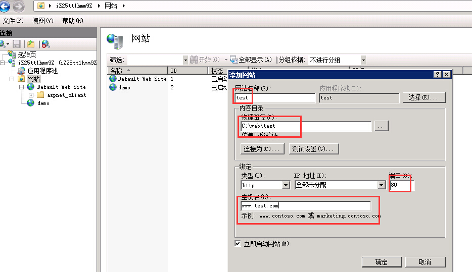 ECS Windows IIS如何用80端口创建多个站点 服务器如果配置多个站点都用的是80端口,这样访问不同域名,IIS接收到请求是通过http request的host来区分访问哪个站点的。如下图所示: 如果如果服务器配置多个站点都用80端口,需要绑定不同的主机头也就是绑定不同的域名,比如服务器已经创建一个站点www.demo.com,端口绑定是80,如下图所示: 这时候想再创建一个站点还用80端口,如下图,新建一个站点,指定网站路径,主机名设置不同的域名,端口还是80: 点击确定新网站就创建完成了,然后设置站点默认首页,点击iis--默认文档可以设置自己的默认首页,如下图所示: 自己站点主页如果在默认列表没有自己手工添加一下就可以了, 这样www.demo.com和www.test.com都解析指向服务器ip,端口都是80,访问不同域名打开的就是不同站点了。 当前页可以同一域名基于不同端口创建多个站点,创建站点的时候绑定域名都一样,端口不一样,这样访问域名比如www.demo.com:80 或者www.demo.com:8080 可以打开两个不同网站,用户可以参考:http://help.aliyun.com/knowledge_detail/7598083.html?spm=5176.7618386.5.1.YRGosz 如果问题还未能解决,您可以到阿里云社区进行免费咨询,或联系云市场商家寻求帮助。
