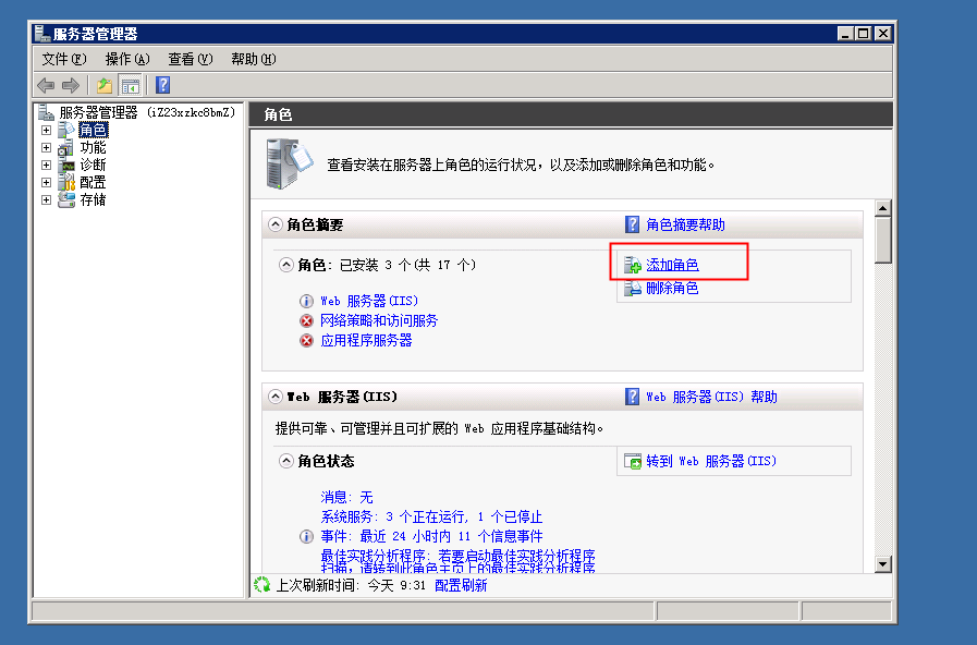 1、首先需要打开服务器管理器右键角色,点击右侧的添加角色。