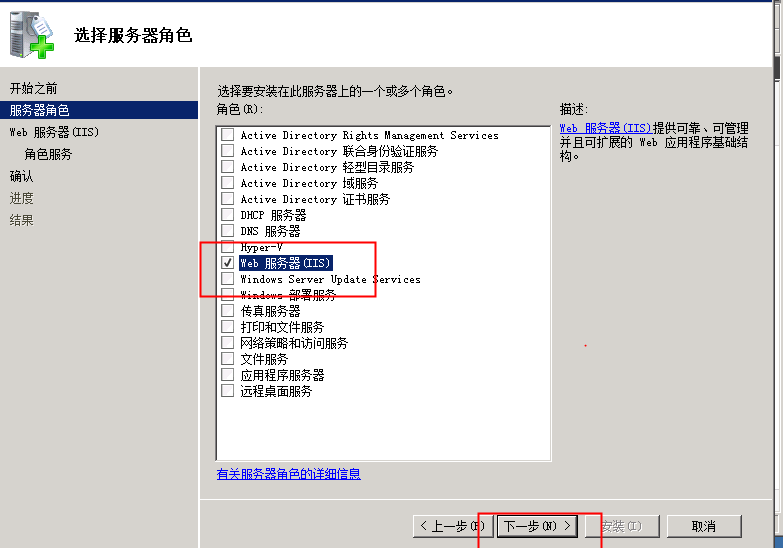2、安装服务角色中选择web服务器IIS,然后点击下一步。