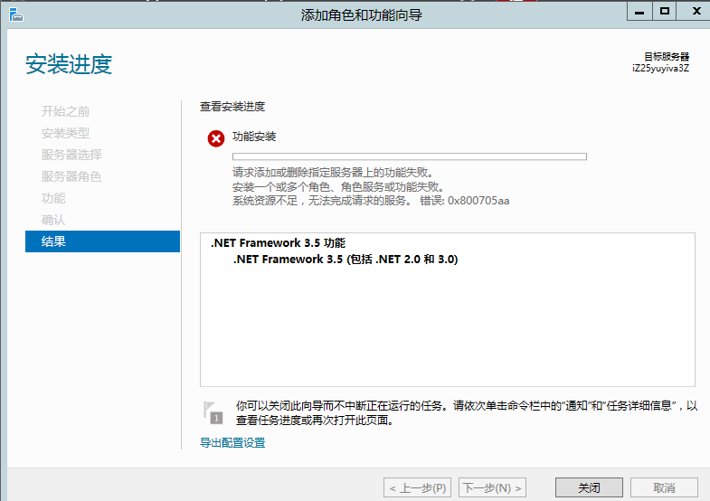 如何处理ECS Windows服务器.NET Framework安装失败 问题描述: ECS Windows Server 2012服务器,安装.NET Framework 3.5时报错:.NET Framework 3.5(包括 .NET 2.0和3.0)。如下图所示: 分析解决: 出现该问题一般是由于程序版本不兼容所导致的,或者是当期安装的版本与已有版本冲突导致的。 解决步骤如下所示: 1、用户首先 点击【开始】--【控制面板】--【程序和功能】。如下图所示: 2、在程序列表中,排查是否已安装了该程序的其他版本,如果有,需要先进行卸载。 3、使用更高版本的.NET Framework 4.5再次安装部署测试,程序即可安装成功。如图所示: 如问题还未解决,请联系售后技术支持。