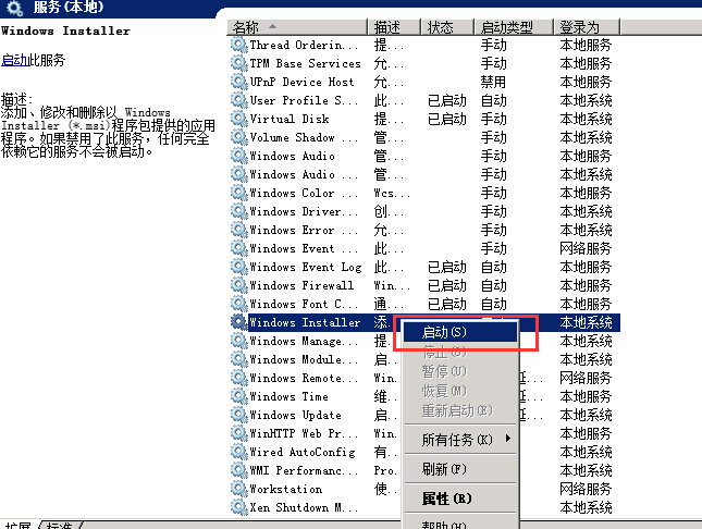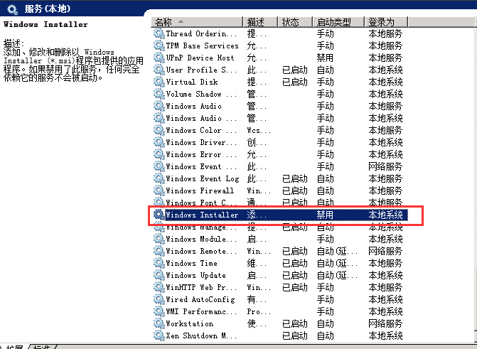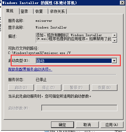 如何解决Windows 服务器无法安装.msi后缀的安装包 问题描述: 用户下载的.msi后缀的安装包,在服务器内双击安装不了,提示错误如下图所示: 问题分析: 出现此问题是系统服务中的"Windows Installer"服务被禁用导致, 问题解决: 1.首先点击开始-运行-输入services.msc,打开服务。 2.然后找到"Windows Installer"服务。 3.鼠标双击打开服务,将启动类型改为自动,然后点击确定。 4.鼠标右键再次点击"Windows Installer",选择启动,服务启动后,在安装.msi的安装包就可以了。如下图所示: 如有问题,请联系售后支持