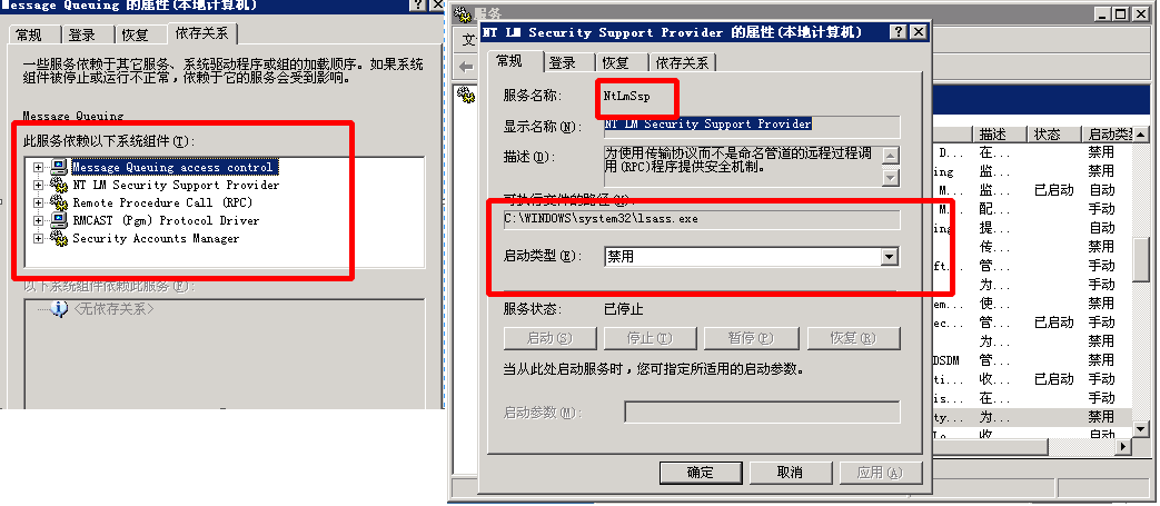 如何解决ECS Windows 2003服务器安装消息队列报错:0x42c 问题描述: ECS Windows 2003系统安装【消息队列服务】时,出现错误如所示: 无法启动MSMQ服务。 错误代码: 0x42c 错误描述: 依存服务或组件无法启动。 如图所示: 问题分析: 出现该错误一般是由于MSMQ服务所依赖的其它相关服务无法正常启动所导致的。 MSMQ服务启动依赖如下服务,首先必须确保下列服务能正常启动并处于运行状态,才能确保MSMQ服务的安装和运行: Message Queuing access control NT LM Security Support Provider Remote Procedure Call (RPC) RMCAST (Pgm) Protocol Driver Security Accounts Manager 解决方法: 用户可以通过如下方式确认和修改相关服务状态: 1)点击【开始】--【运行】--执行“services.msc”命令,打开Windows服务管理器。 2)找到上述服务,双击或右键选择【属性】,确认相关服务启动类型不是【禁用】。 3)如果启动类型是【禁用】,需要用户手动将其修改为【自动】就可以了。 4)重新按照正常步骤尝试安装MSMQ消息队列服务即可完成。如下图所示: 如问题还未解决,请联系售后技术支持。